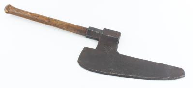 B68-307 GOOSEWING AXE. Pennsylvania style goosewing axe, upswung form with fine deeply struck maker's mark in the shape of two hearts on either side of what looks like an anchor. 15" blade and 15" original handle. One chip from end of handle, metal oxidized but no pitting. Rare. From the collection of John Henson. Good+ 200-400