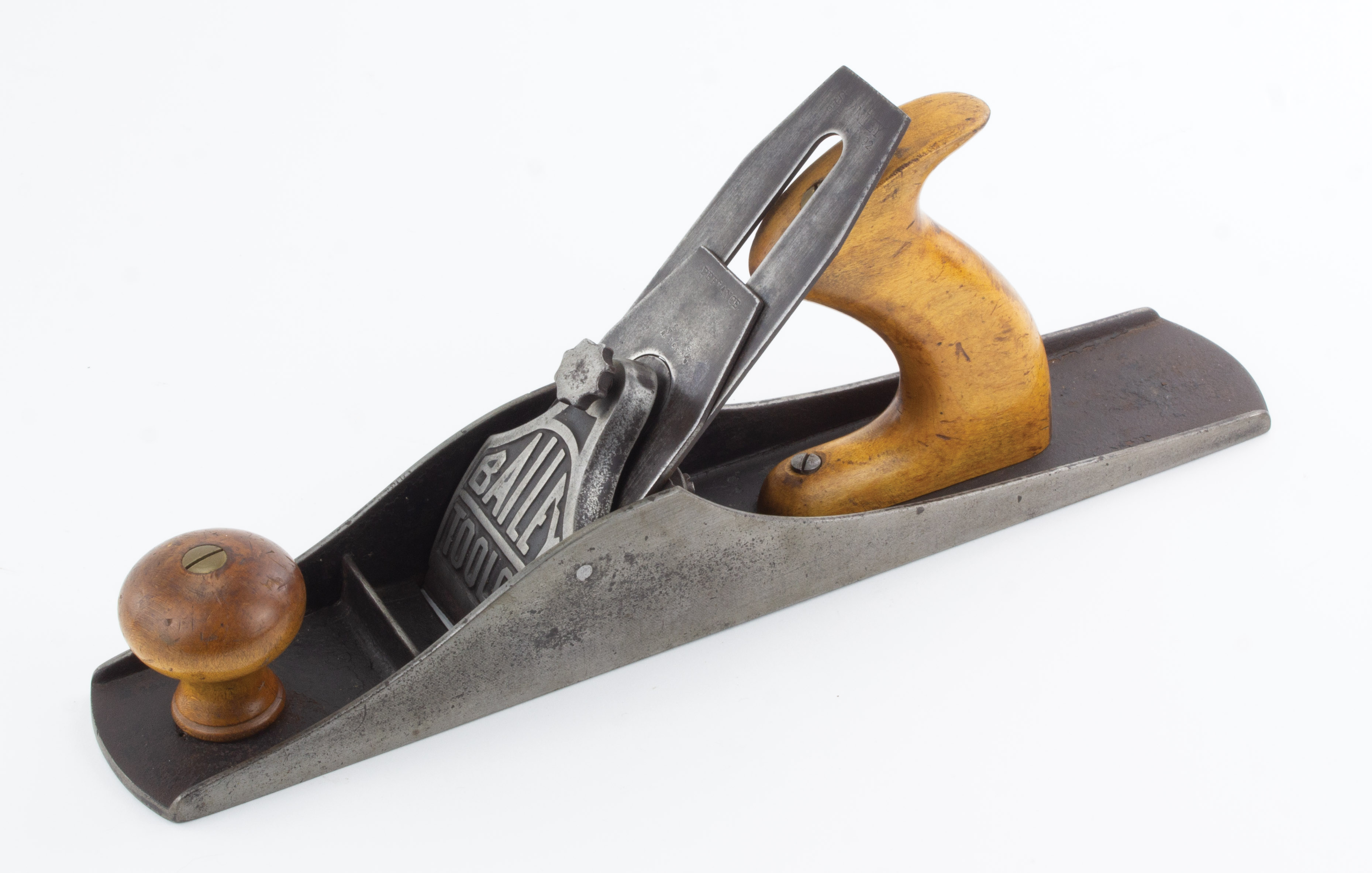 B68-309 JACK PLANE. Bailey Tool Co. No. 15. With the lever-type adjustment shown in PTAMPIA I, Figure 69, "Bailey Tool Co." cast into lever cap with "10" cast on reverse; Stanley 1892 patent date cutter but original BTC marked chip breaker, japanning 80%, beech tote and knob very clean. From the collection of Harold Unruh. Good+ 200-400