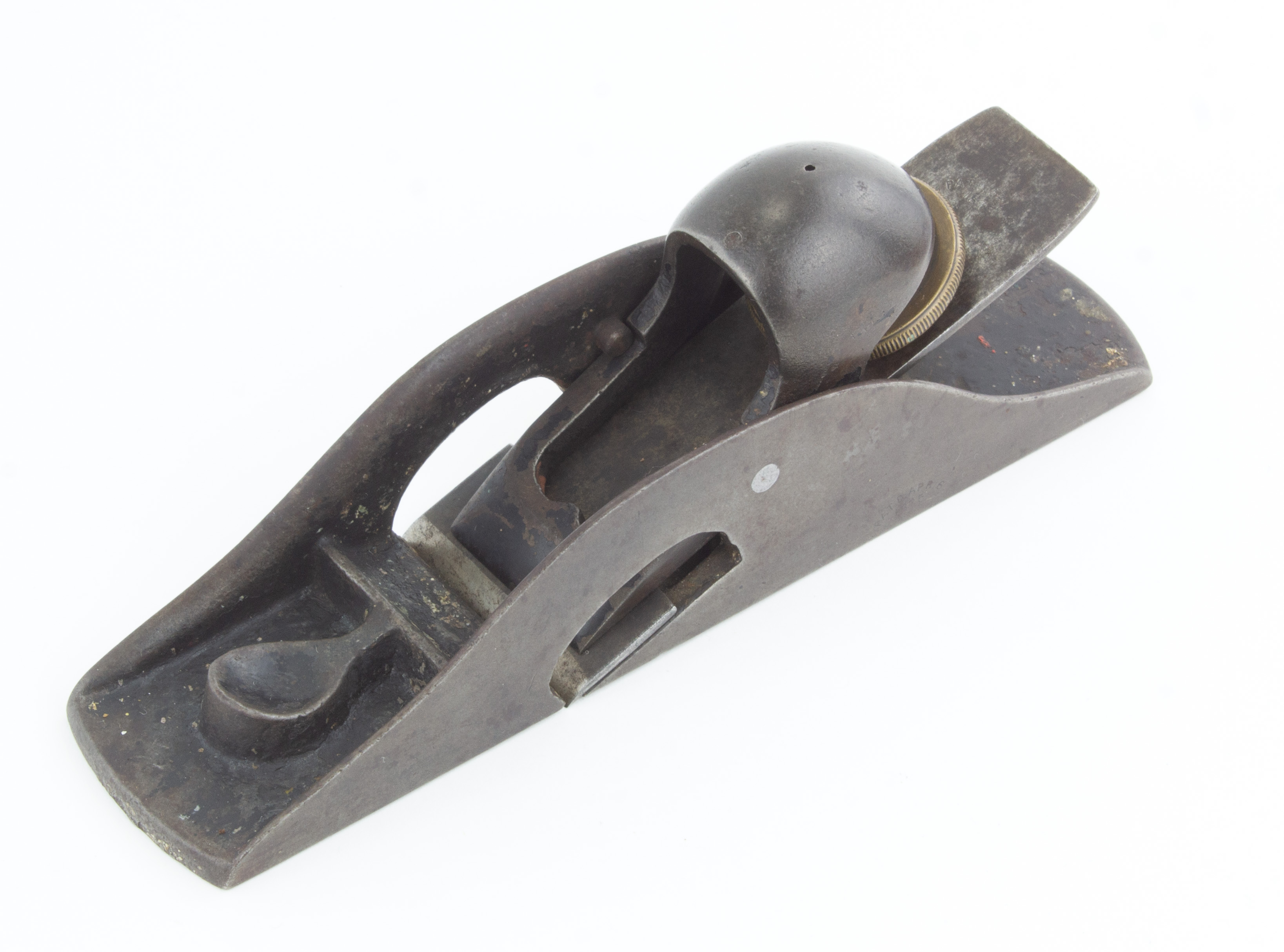 B68-310 RABBETING BLOCK PLANE. Norwood. Patented by John E. Norwood on April 6, 1875, the patented feature was the fact that the cutter extends to the edge of the sole through openings in both cheeks so it could be used to cut rabbets as well as used as a traditional block plane. See PTAMPIA I, Figure 162. Manufacturer is unknown. Plane has 7-1/2" sole, 1-3/4" cutter marked with patent date. Japanning 50%, metal clean. Good 200-400