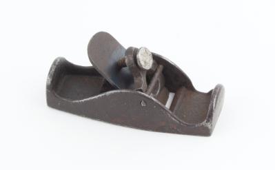 B68-318 MINIATURE BLOCK PLANE. Body is similar to a Bailey Little Victor, but lever cap with open circle is held by thumb screw and bar. Thumbscrew is bent and could be a replacement. Japanning 50%. Unusual. From the collection of Harold Unruh. Good 50-100