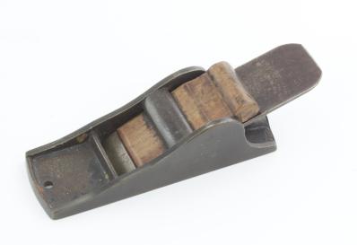 B68-321 BLOCK PLANE. Metallic Plane Co. Nonadjustable type with simple wood wedge, 5-1/2" long, original cutter with "Excelsior" mark, shown in Figure 208 of PTAMPIA I. Chip from heel and hang hole drilled in toe. Light wear to wedge. Japanning 90%. From the collection of David Jeffers. Good 100-200