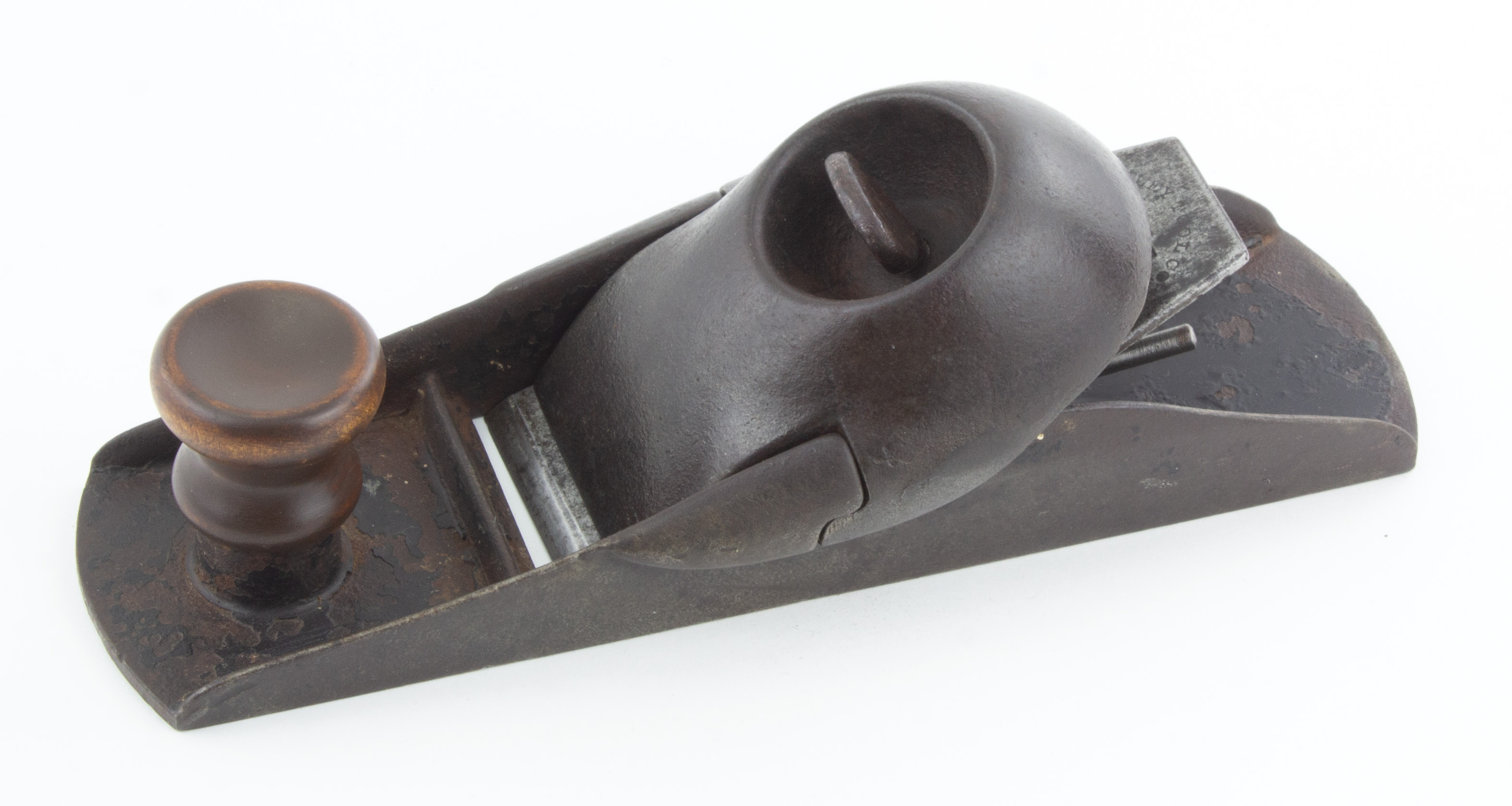B68-324 BLOCK PLANE. Bailey Tool Co. Model D. Original marked cutter and replaced wooden knob. Japanning 75%. Metal has surface oxidation but no pitting. Looped cutter adjustment lever has been replaced with a plain steel rod. From the collection of Steve Dice. Good- 100-200