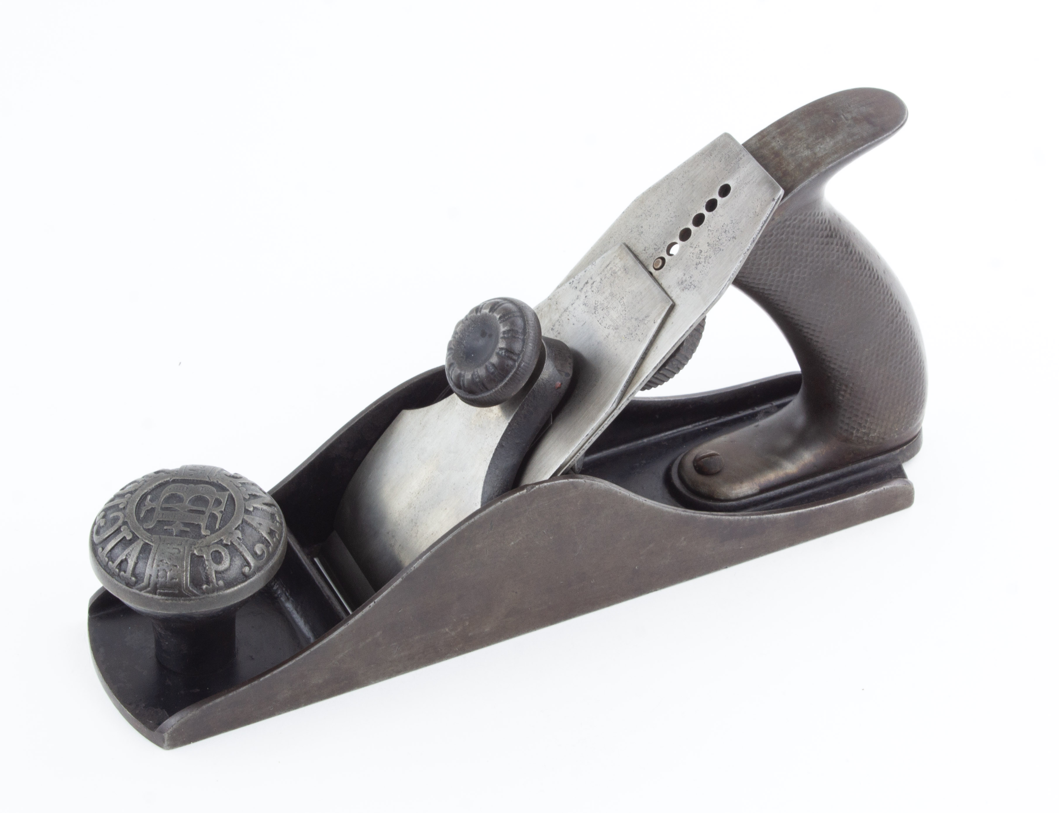 B68-333 SMOOTHING PLANE. Bailey Victor No. 3. 8-1/2" sole with 1-3/4" unmarked cutter, marked chip breaker, cast iron tote. Early type with the lever cap screw rather than loop fastener. Japanning 95%. Good casting on knob. Good+ 300-600
