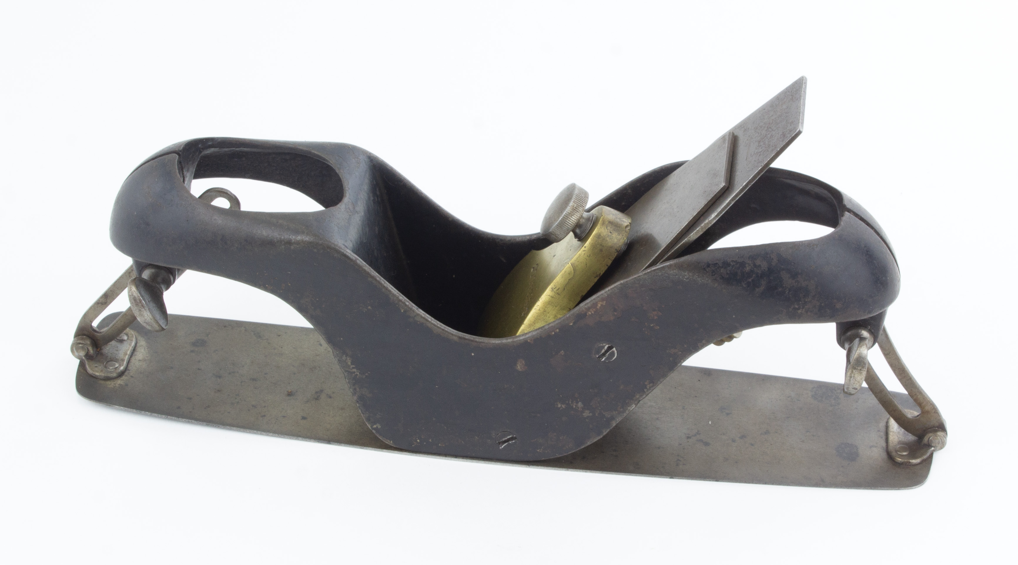 B68-334 FLEXIBLE SOLE PLANE. Bailey Tool Co. Defiance No. 9. One of the rarest of the flexible soles and frequently mistaken for the Bailey Victor No. 10 that was manufactured by Stanley, this was based on Williams' 1875 patent and sold only for a few years by Selden Bailey. In addition to the sole adjustments it has a unique offset cutter adjustment. Battleaxe cutter, japanning 80%, replaced brass lever cap with user stamp. Good 200-400