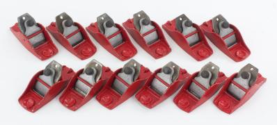 B68-338 LOT OF TWELVE MINIATURE BLOCK PLANES IOB. Knapp "Lion" Planes. Aluminum planes similar to the Stanley No. 102 with red japanning and original cutters. Box has torn lid but all pieces included. Label marked "Lion Midget Utility Planes" and "Knapp Foundry Co." From the collection of Harold Unruh. Good+ 150-300