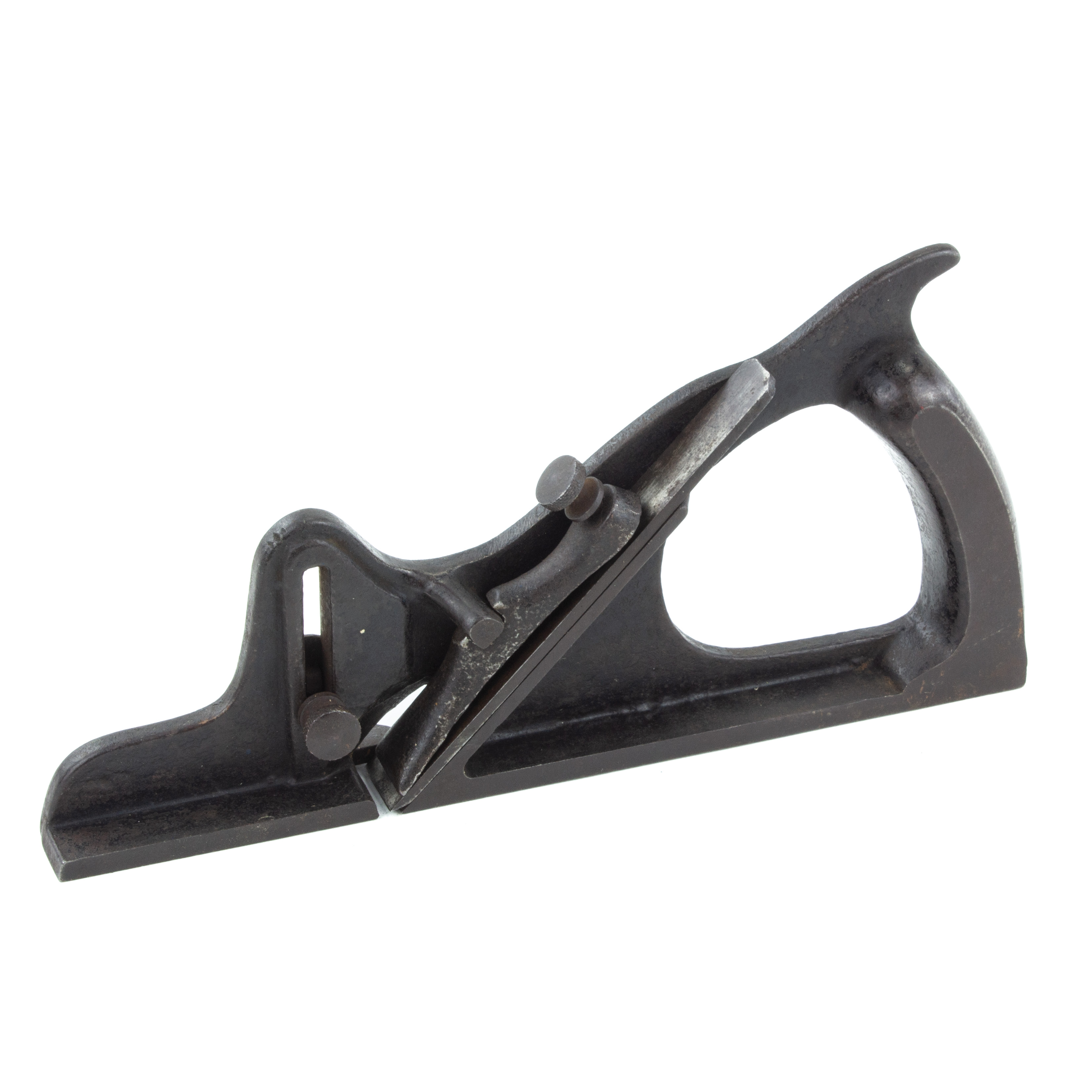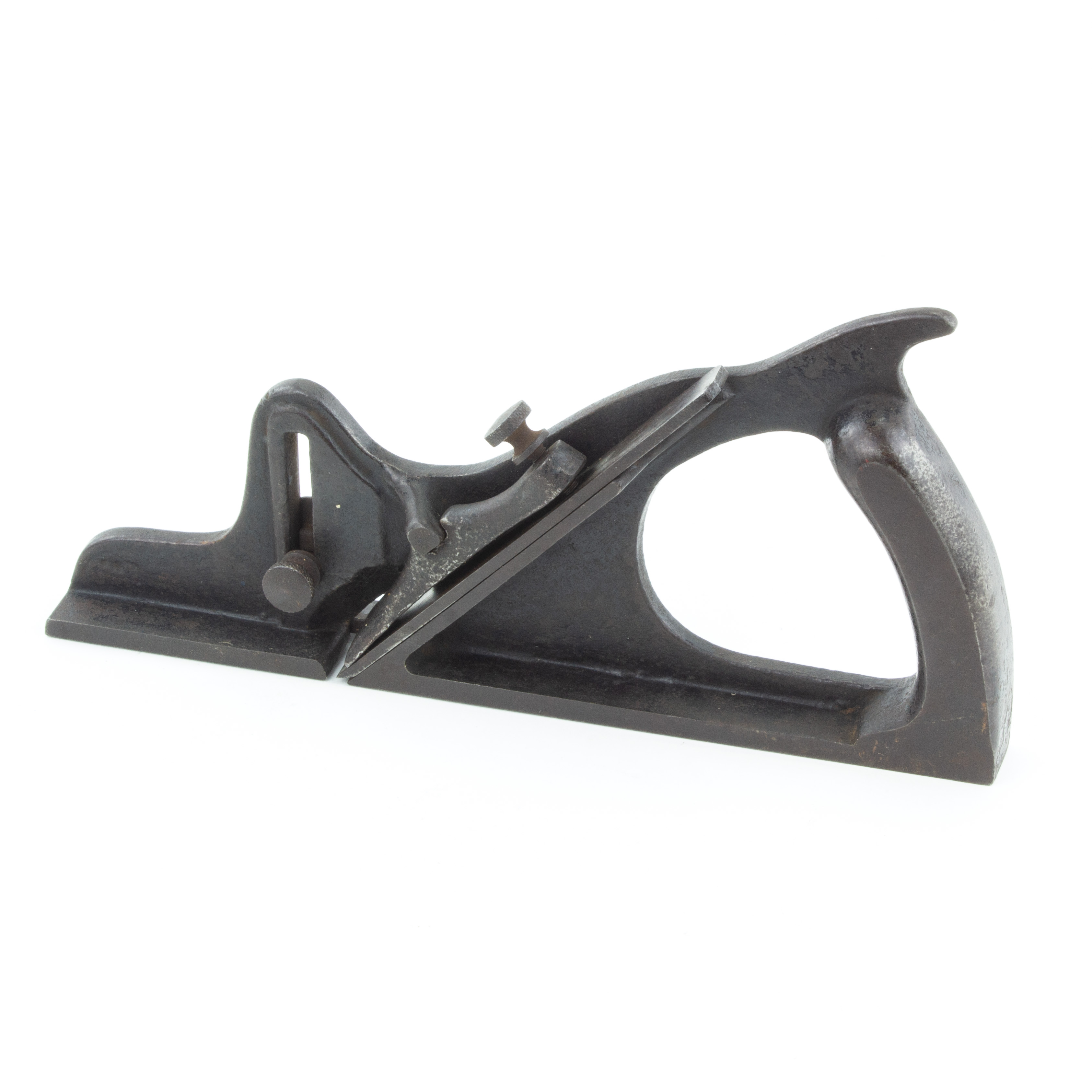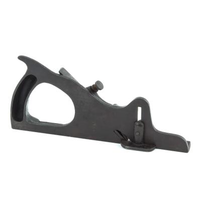 B68-343 RABBET PLANE. S.C. Tatum & Co. Patented by George Hilles on 6/30/84 and sold by Samuel Tatum of Cincinnati. A handful of these are known, with different configurations. This one is identical to the one shown in Figure 173 of PTAMPIA I but without the patent date and the depth stop locking screw is on the opposite side than the example pictured. Japanning 60%, unmarked cutter. From the collection of Harold Unruh. Good+ 250-500