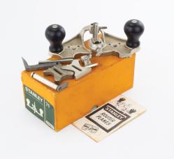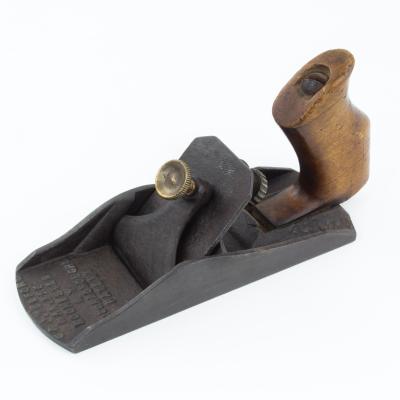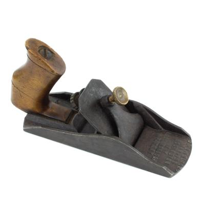 B68-344 SMOOTHING PLANE. Loughborough Patent. Among the rarest and most sought after of the early patented planes, based on William Loughborough's first 1854 patent and manufactured for two years by G & J Telford of Rochester. Identical to the example shown in Figure 20 of PTAMPIA I, including the markings cast into the toe, but with a 7" sole. The only example we've ever seen in this length and probably the rarest No. 2 size plane you'll ever see. Two cracks in the tote, metal has oxidation but no damage. One of the holy grails of patented plane collectors. From the collection of Harold Unruh. Good 2000-4000