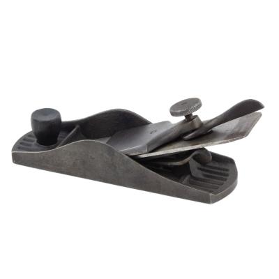 B68-345 BLOCK PLANE. Chaplin's Improved Patent. Uncommon version with 7" sole, corrugated on bed only, no tote, non-adjustable throat, wooden knob. Replacement A.C. Bartlett cutter. Stamped "Chaplin's Improved" with four patent dates on left cheek. Metal oxidized and nickel worn off lever cap with small nick on base of lever cap, but no rust or pitting. From the collection of Harold Unruh. Good 200-400