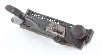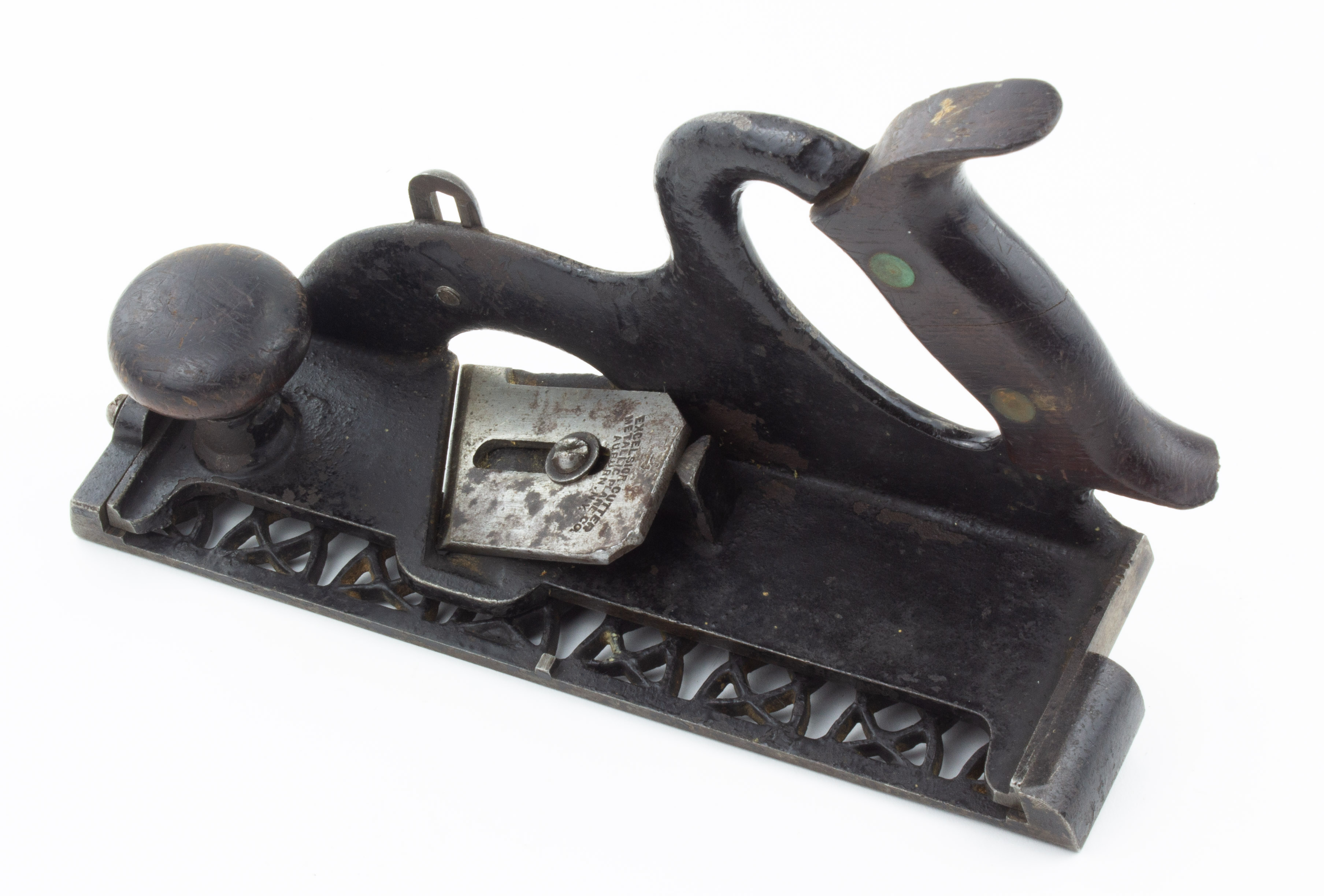 B68-351 IRON FILLETSTER PLANE. Metallic Plane Co. The plane shown in Figure 213 of PTAMPIA I, including the almost always missing decorative fence and depth stop. Original marked cutter with mild pitting, rosewood tote with chip and reglued horn and crack, japanning 85%. Good 400-800