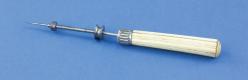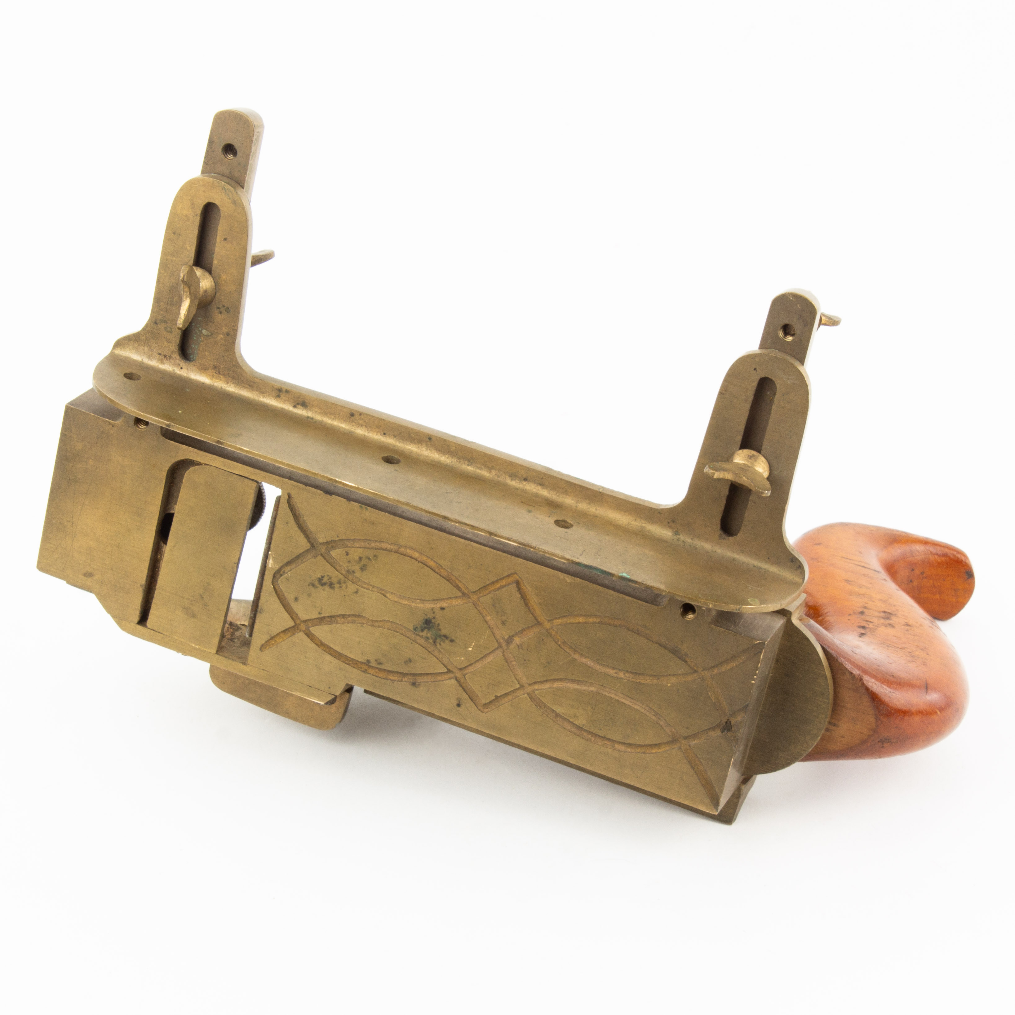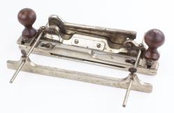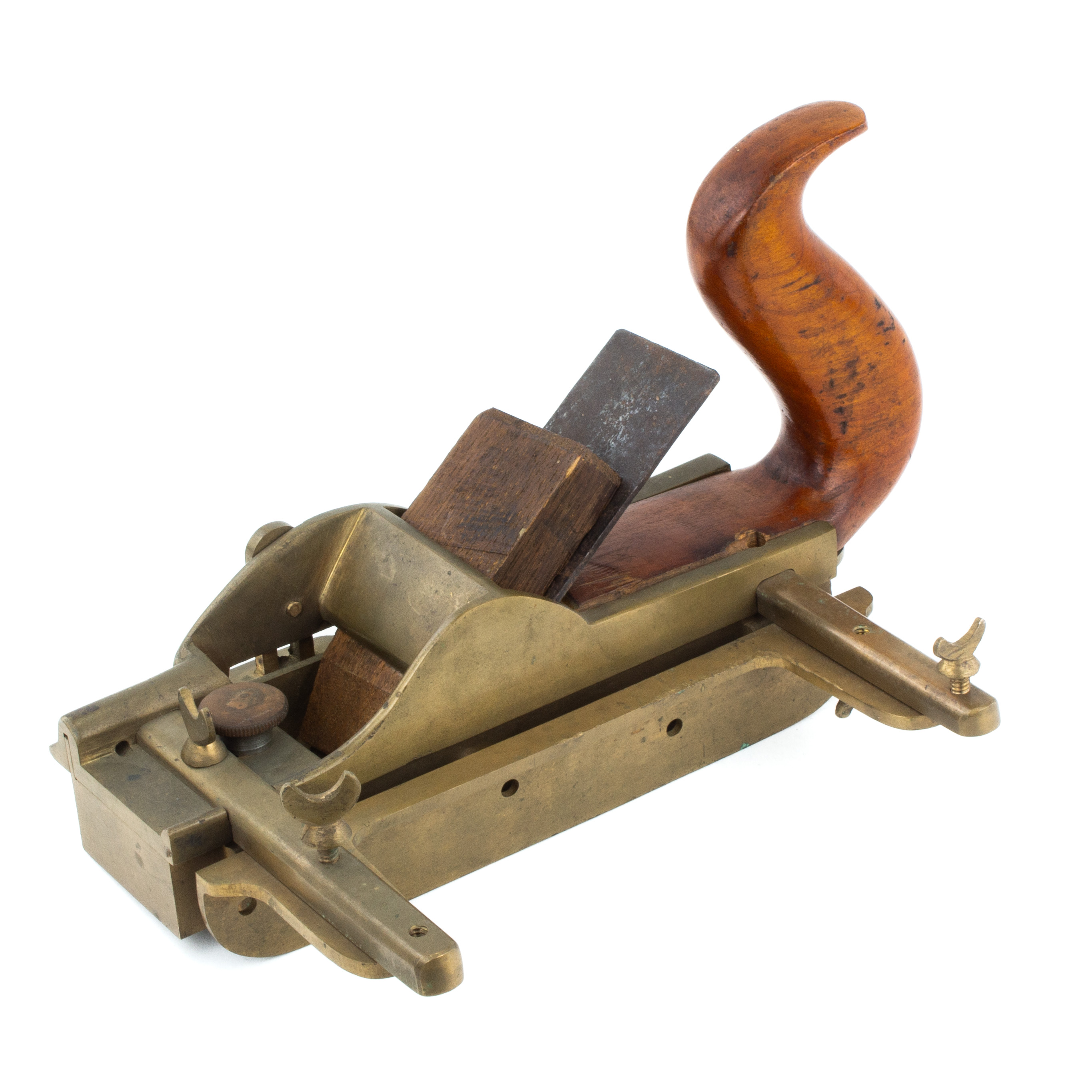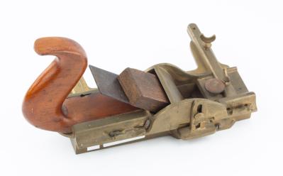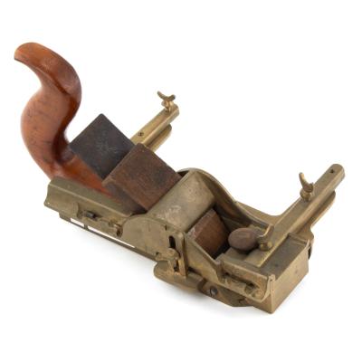 B68-352 FENCED FILLETSTER PLANE. Unmarked, and has a handmade look, possibly a prototype. Brass body and fence with beech tote and wedge. 1-5/8" cutter marked "P*ML." The sole has an adjustable throat and decorative pattern of grooves presumably to reduce friction. The fence slides on brass arms and is locked with thumbscrew on the underside, there are also matching thumbscrews on top of the arms, the function of which is unclear. The fence has three holes that may have been intended for a wooden face that is not there. The whole thing is very well made, but we can't say if it was ever manufactured or patented. From the collection of Harold Unruh. Good+ 200-400