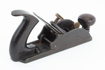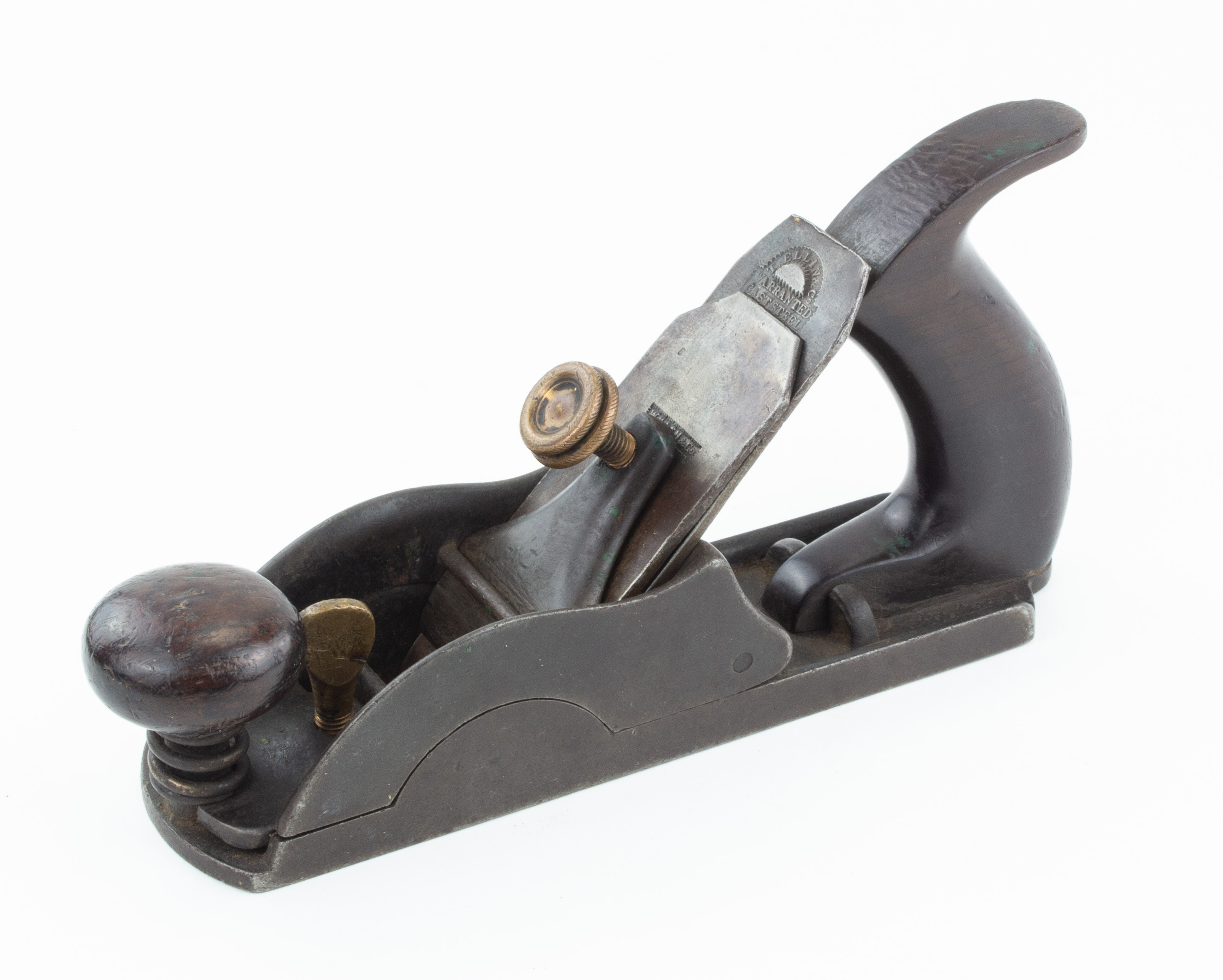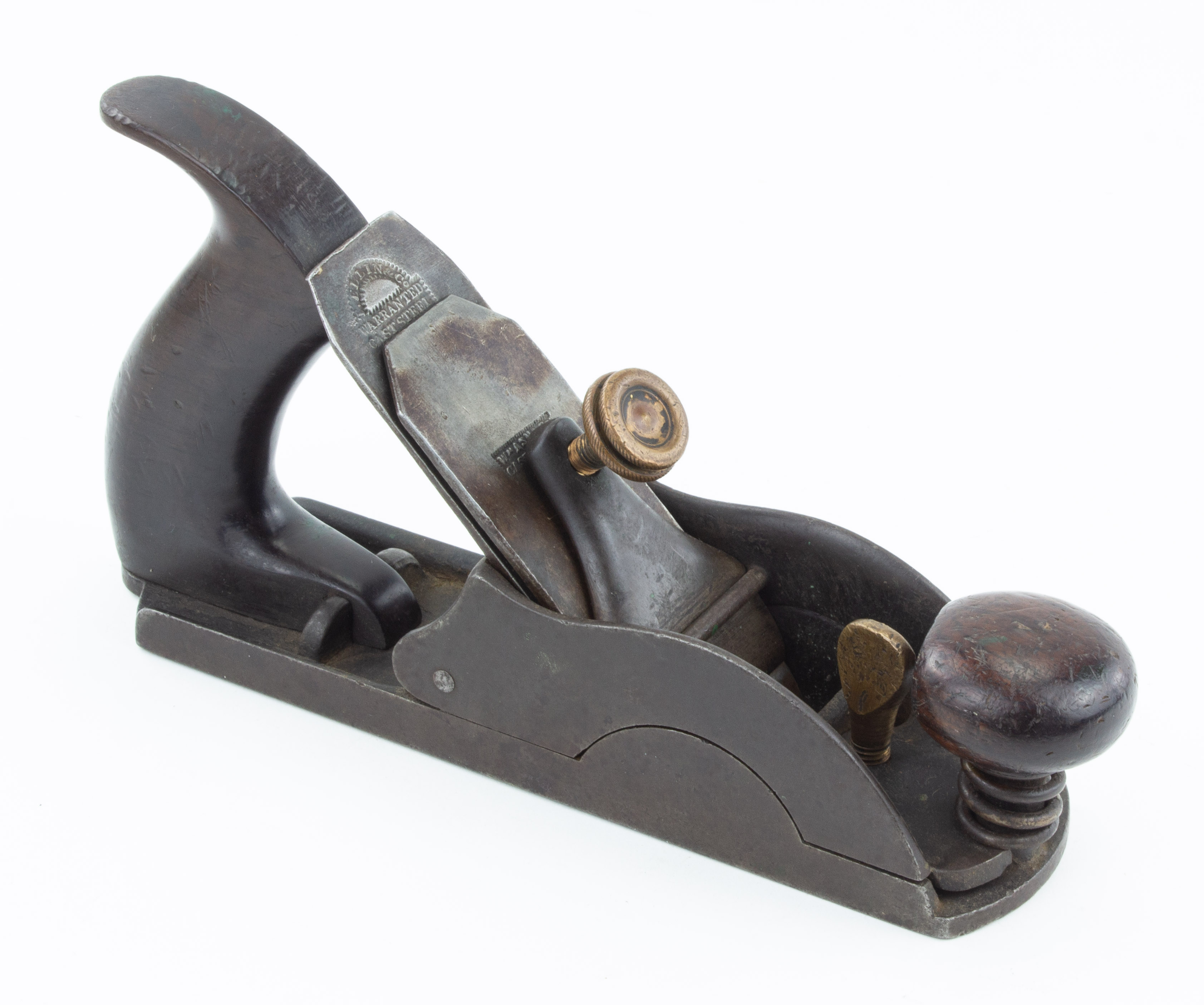 B68-353 SMOOTHING PLANE. Leonard Bailey Split Frame. Series B-2 type with 8-1/2" sole, 1-3/4" T. Ellin cutter, slightly spalled, with Wm Ash chipbreaker. Paddle-shaped adjustment screw, and the knob has been squared off at the rear to accommodate the screw. Rosewood tote that appears original, with some dings but no damage. Slip-in lever cap, brass cap screw is worn but intact. See Van Pernis & Wells, Figure 1-17. Metal oxidized but clean. An excellent example of one of the holy grails of patented plane collecting. From the collection of Harold Unruh. Good+ 3000-6000