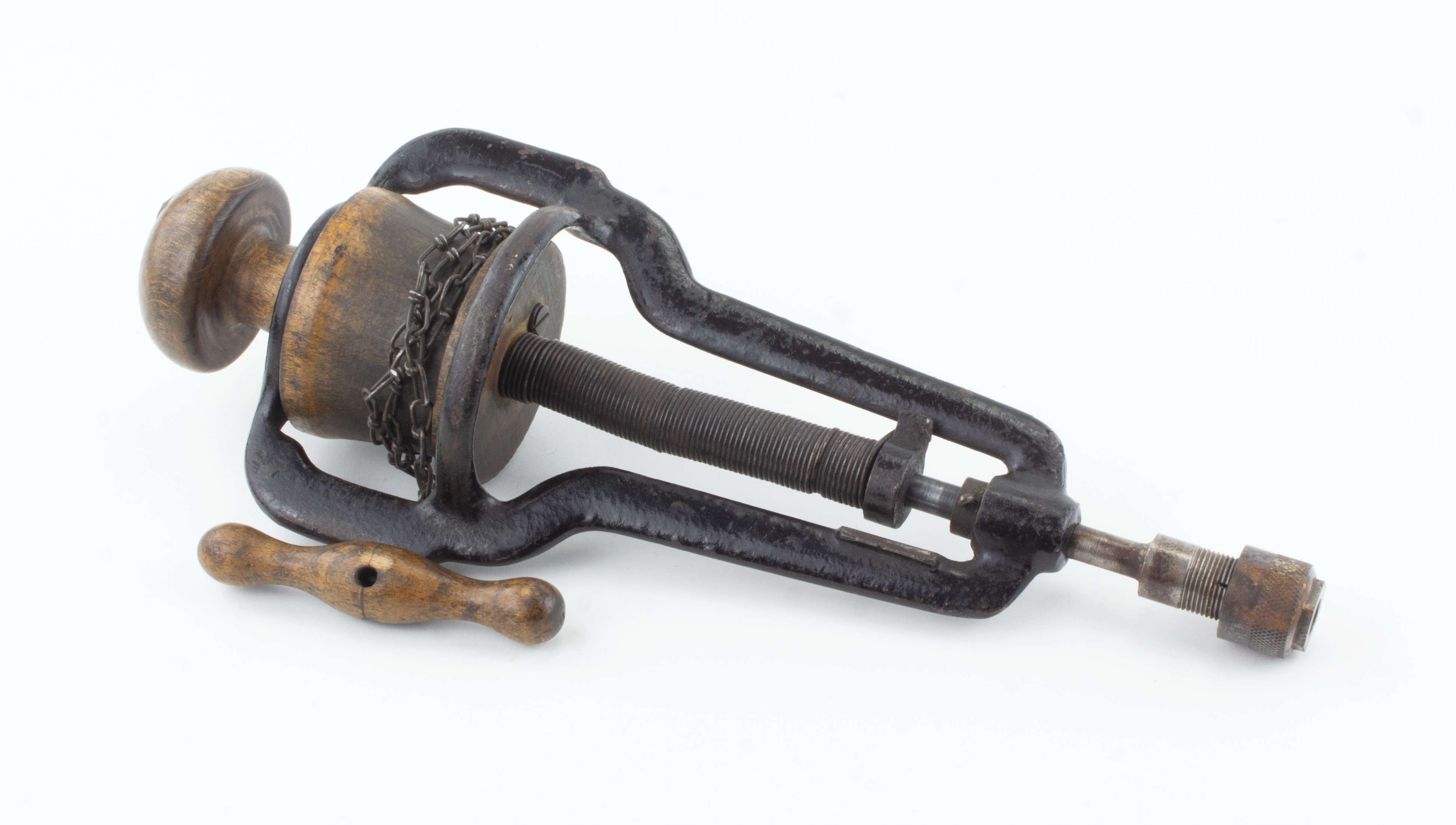 Uncommon variation on the bow drill in which the drilling motion is produced by pulling on a spring-powered armature that automatically returns. There are a few versions around but all are uncommon; this one is 13-1/2" long with a japanned cast iron frame and wooden handle, drum and knob. Unmarked. Japanning is about 80%, wood has moderate wear. Return mechanism doesn't seem to be working but looks like a little lubrication and adjustment would do the trick. Good 120-240