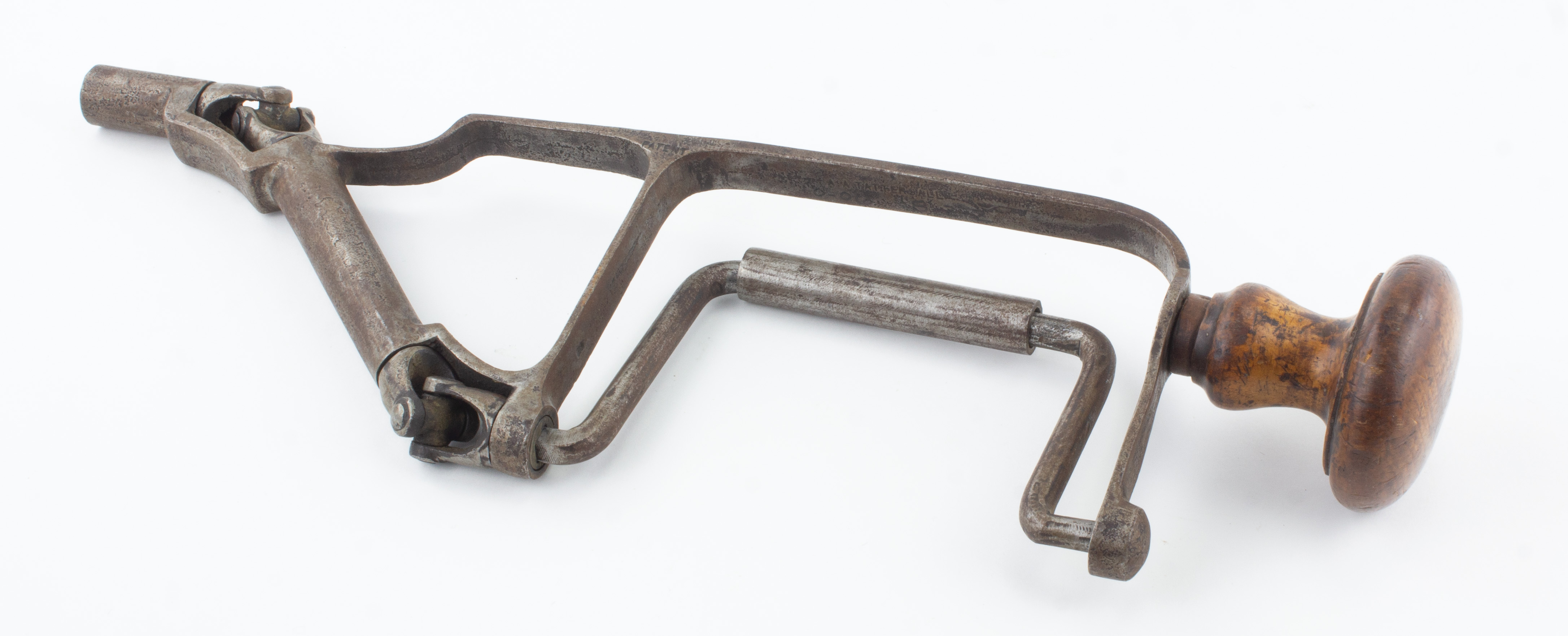 B68-365 UNIVERSAL JOINT BRACE. Derlon Patent. Patented in 1892 and with a very high gizmocity rating. This is the oldest version, cast iron without nickel plating or japanning, with a knob rather than vertical handle, a simple iron tube for the grip, and with an open socket rather than a chuck; marked only "Patent." They're fairly crude and look handmade but enough have been found to indicate that it was the first manufactured version. All Derlons are uncommon; this version is very rare. Metal has light surface oxidation, some dings and staining on knob; works smoothly. From the collection of Jim and Christa Schoenky. Good 200-400