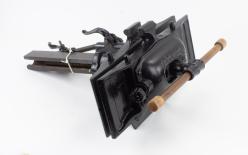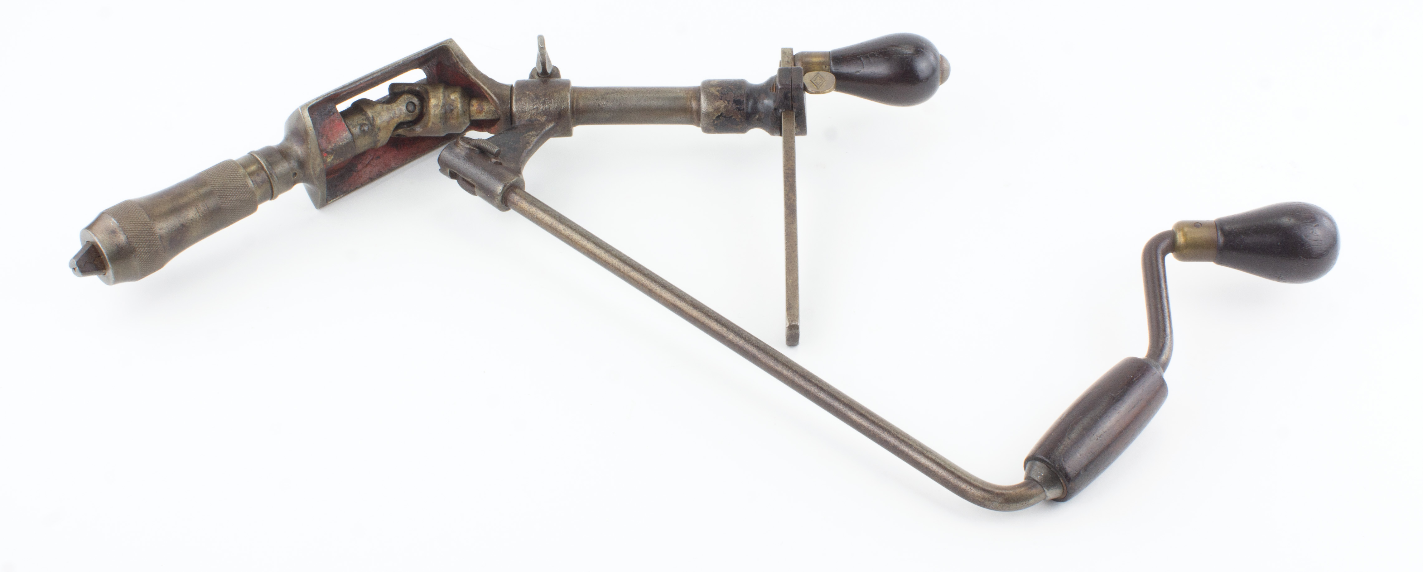 B68-370 CORNER BRACE. McClellan Patent. Stephen McClellan received four patents for variations on this pattern: two in San Marcos TX in 1897 and two after he moved to New York. All are rated either A or B in Pearson. This is the 1900 patent with the fixed rear handle, and v-shaped guide that rotates to different positions. Nickel mostly gone but about 50% of the red japanning in the guide, works smoothly. As with most, includes a Millers Falls chuck. From the collection of David Jeffers. Good+ 75-150