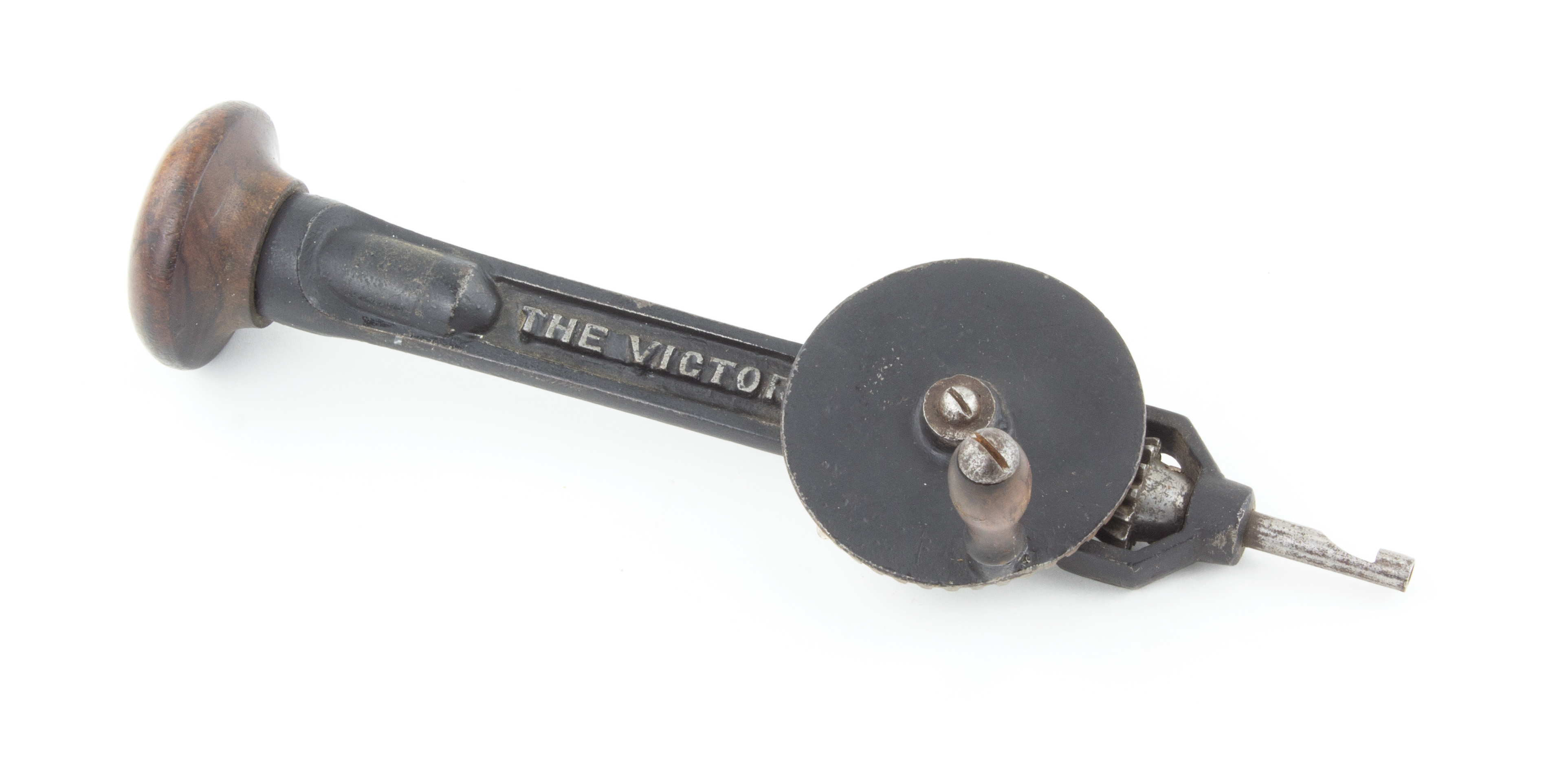 B68-371 JEWELER'S DRILL. The Victor. Cast iron with rosewood knob, 8-1/2" long, has "The Victor" cast into one side and "Reg. No. 101614" which looks like a British registered design patent cast into the other. Japanning 95%, works smoothly. From the collection of Jim and Christa Schoenky. Good+ 60-120