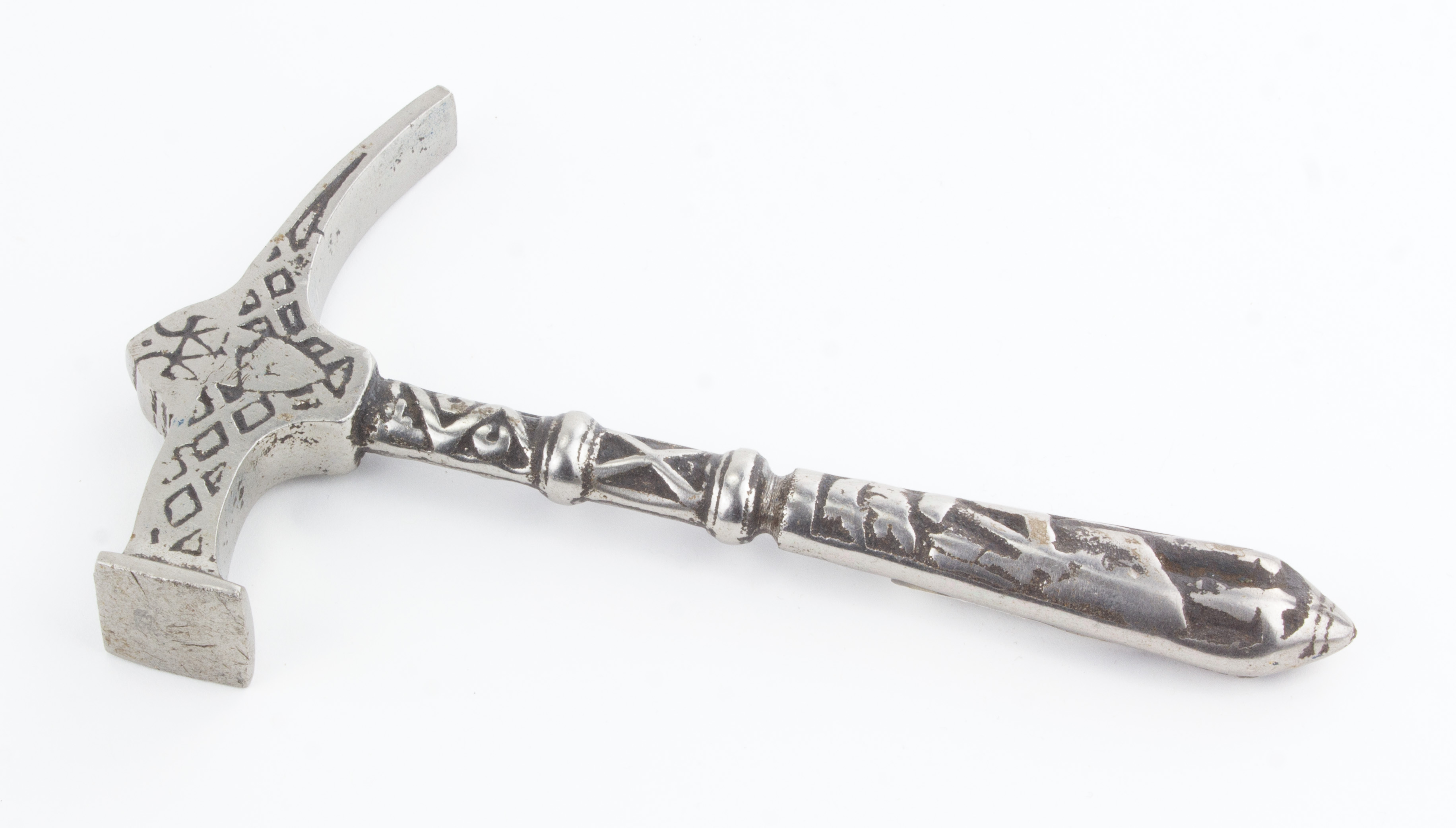 B68-379 CANDY HAMMER. Charles Hennig. 7? long ornately cast nickel plated hammer based on Charles Hennig?s 1901 design patent. Nickel plating mostly complete with some wear. From the collection of David Jeffers. Good 100-200