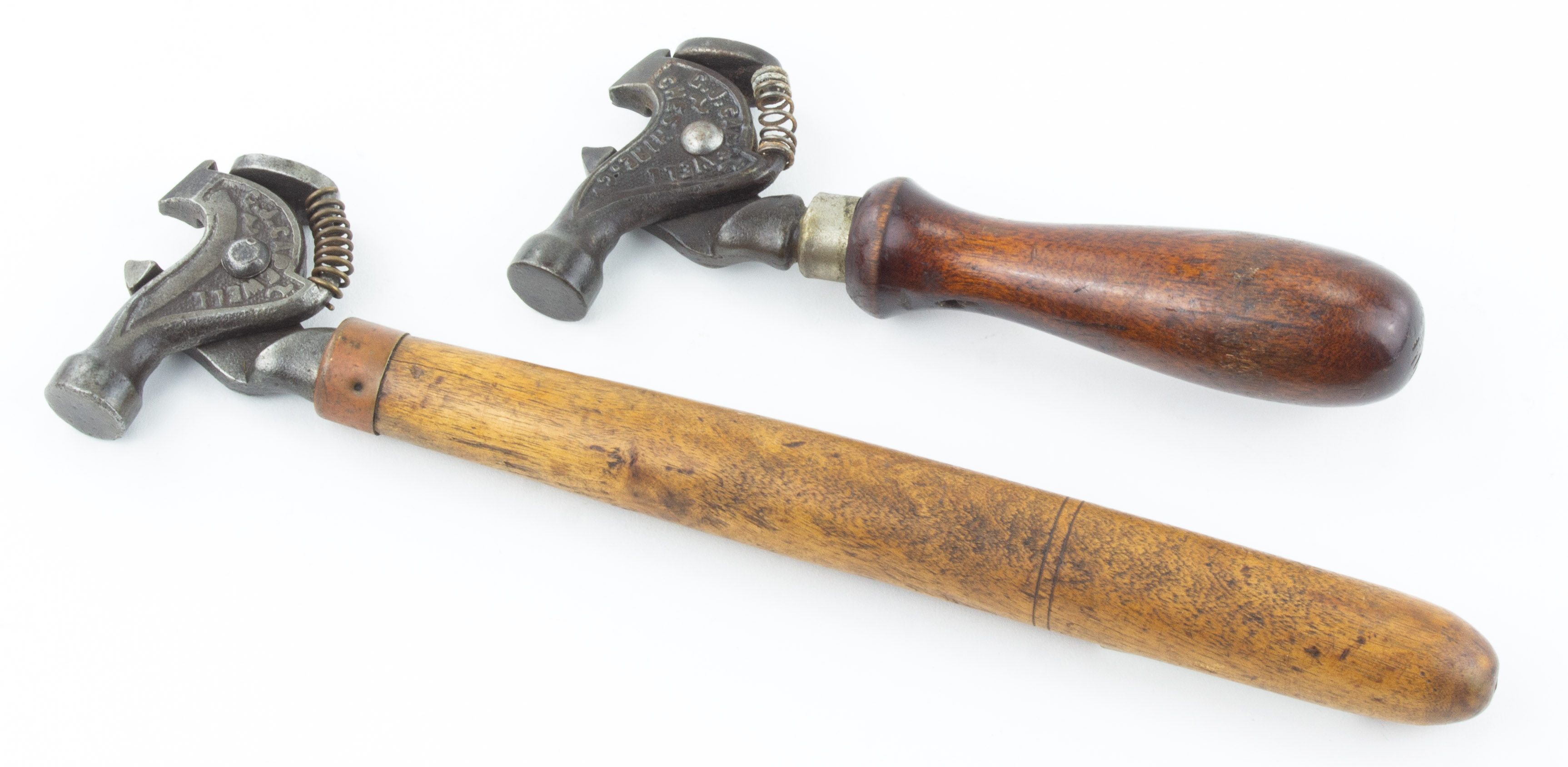 B68-381 LOT OF TWO PATENTED TACK PULLERS. Capewell. Two very clean examples of the 1873 patent of George Capewell, the Thomas Edison of nail pullers. Has patent date cast into heads; one with original 8" handle, the other with 4" rosewood handle. Fine 60-120