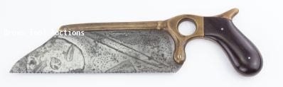 B68-388 BONE SAW. Caswell, Hazard & Co. 7-1/2" blade, brass and rosewood handle, clear mark in brass near finger hole. Blade has oxidation. John R. Caswell and Rowland N. Hazard were partners in a firm known as Caswell, Hazard Co., which operated in the drug business from 1867 until its dissolution in 1876. From the collection of David Jeffers. Good+ 100-200