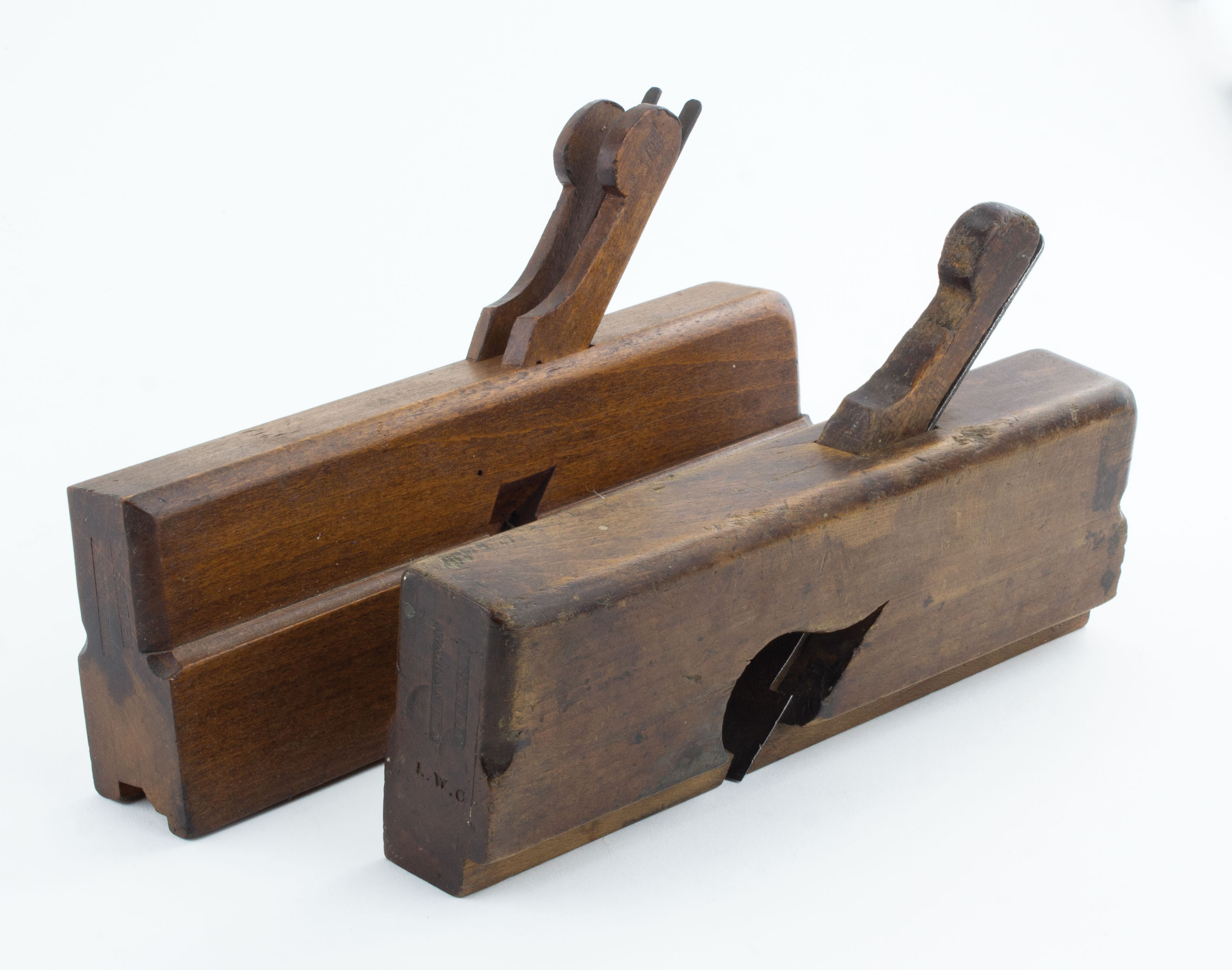 B68-393 LOT OF TWO EIGHTEENTH CENTURY MOLDING PLANES. A. Smith. Standing filletster with 1" skew cutter, 9-1/2" long with rounded chamfers and fluting, C mark; and a nonadjustable sash plane, 9-1/2" long, double cutters, rounded chamfers, A1 mark. The filletster has light wear, the sash is like new. Good & better 200-400