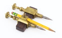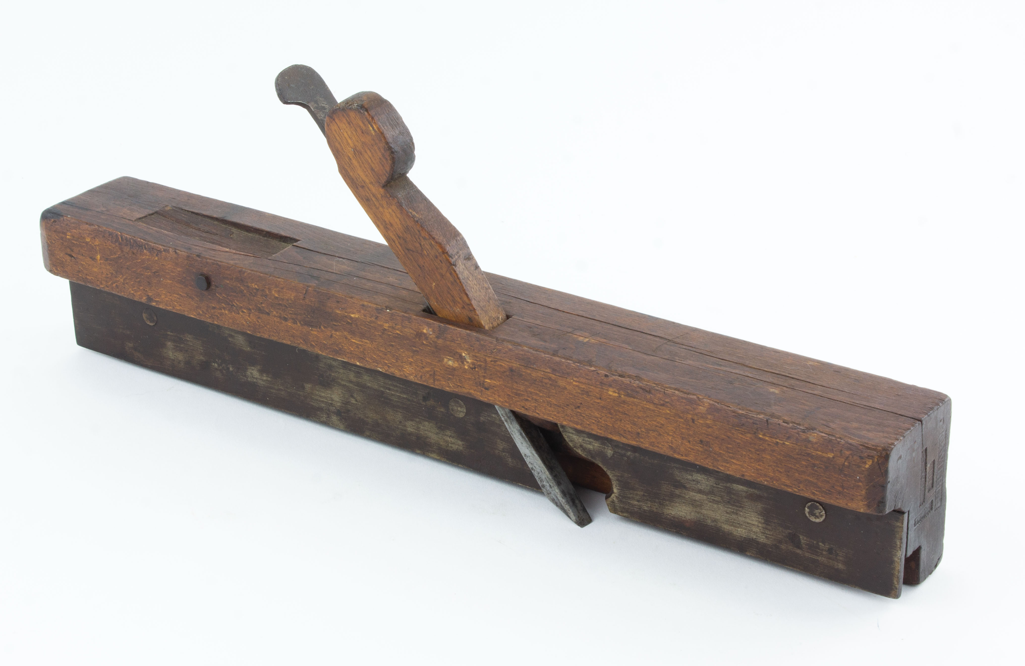 B68-396 GROOVE CUTTER. Jo. Wilbur. Half of a plank match set that cuts a 1/4" groove in a 1" board. 14" long, flat chamfers, relieved wedge, fence is attached with four old iron bolts through the left cheek. There's a rectangular depression behind the throat that looks like it should have held a tote, but it seems too shallow; maybe that's why the tote's MIA. Wilbur's A mark, five stars. From the collection of Hank Allen. Good 50-100