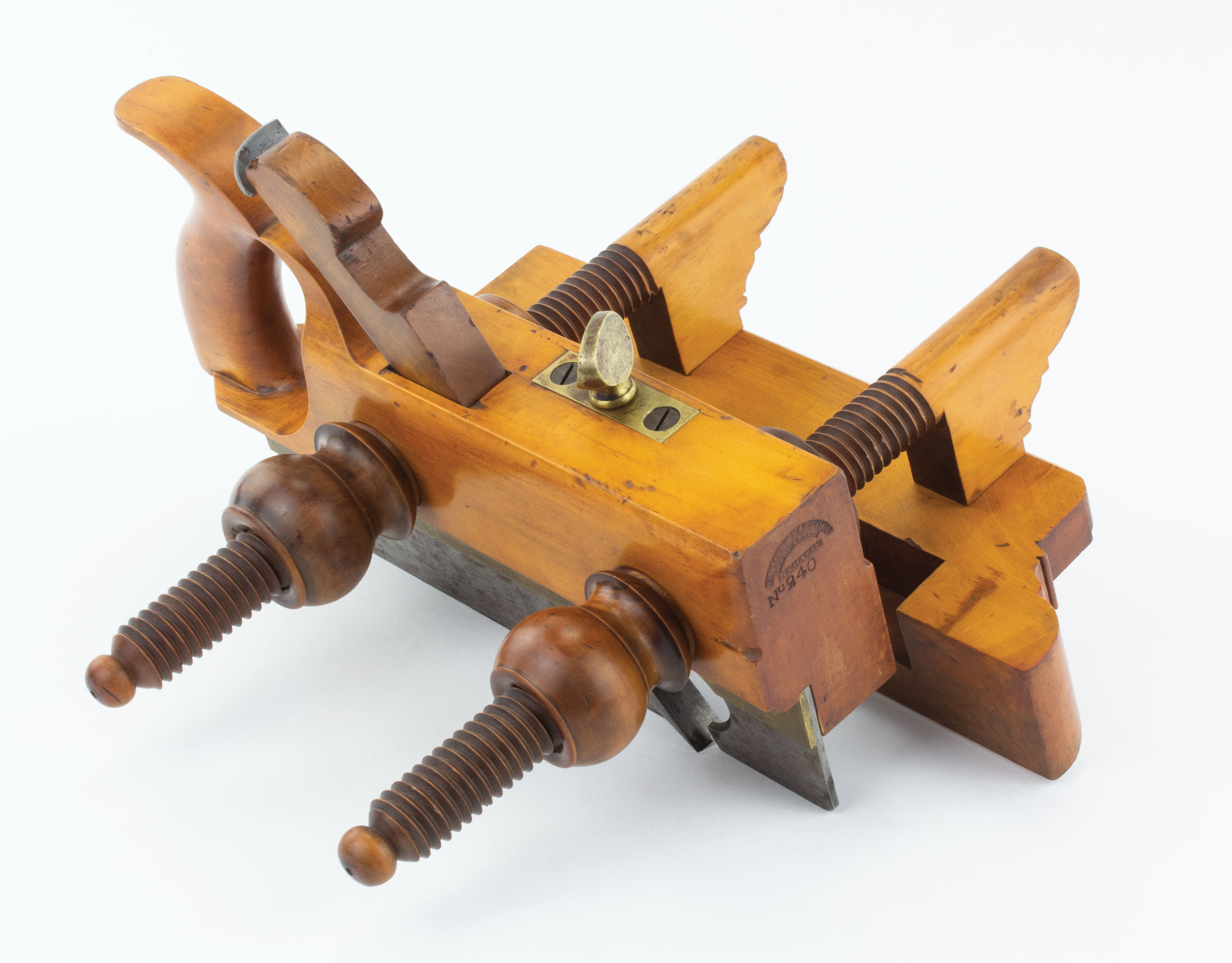 B68-401 HANDLED SCREW-ARM PLOW PLANE. Union Factory No. 240. Solid boxwood throughout, turned ends of arms. Moulson Bros. No. 6 cutter. A few chips from wedge, wood otherwise near perfect. From the collection of Jim and Becky Leamy. Fine 120-240