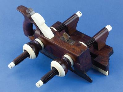 B68-402 SPLIT NUT IVORY TIPPED PLOW PLANE. Solid rosewood throughout. Four turned ivory tips, split ivory nuts, ivory wedge and ivory wear strip on fence. Wood very clean with small chips from toe and fence, a few light stains in wood. Ivory lightly yellowed with scratches, especially on wear strip. One ivory tip has tight crack and another tip may be a replacement. Marked only with user name "F.E. True" on toe. We don't recognize the maker but appears to be old and well made. From the collection of Jim and Becky Leamy. Fine 1000-2000