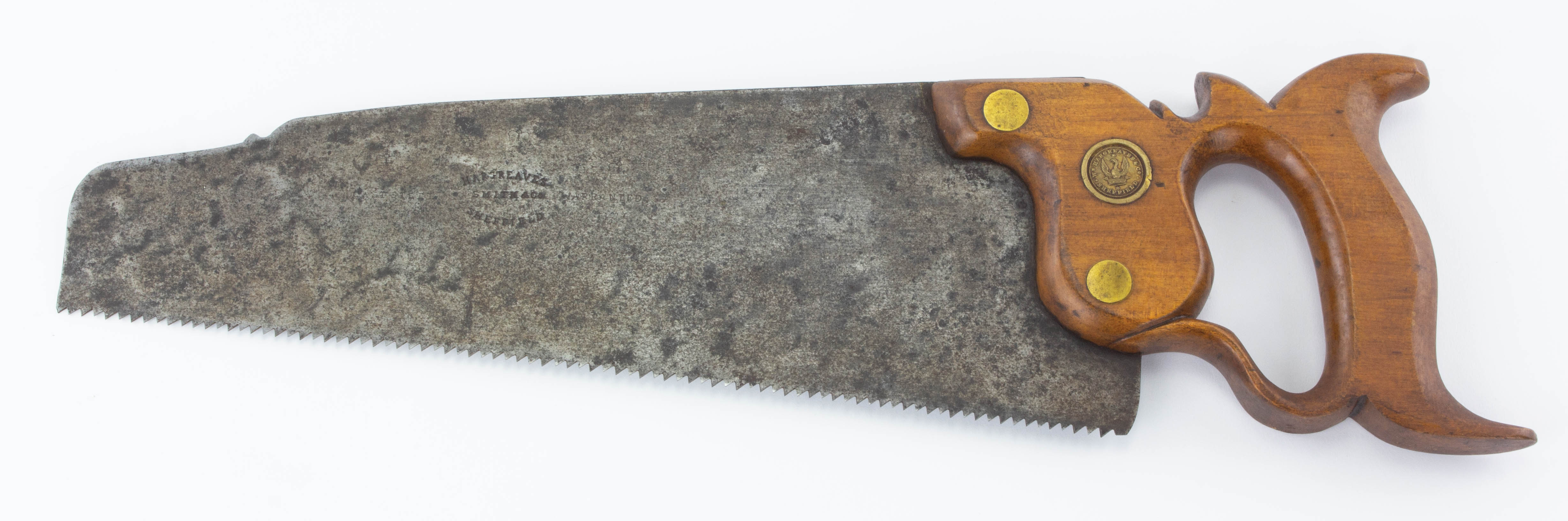 B68-410 PANEL SAW. Hargreaves Smith & Co. 12" blade with nib. Lamb's tongue handle with Hargreaves eagle medallion and split nuts. Light wear to handle. Clear stamp on blade. From the collection of Jerry Kaser. Good 100-200