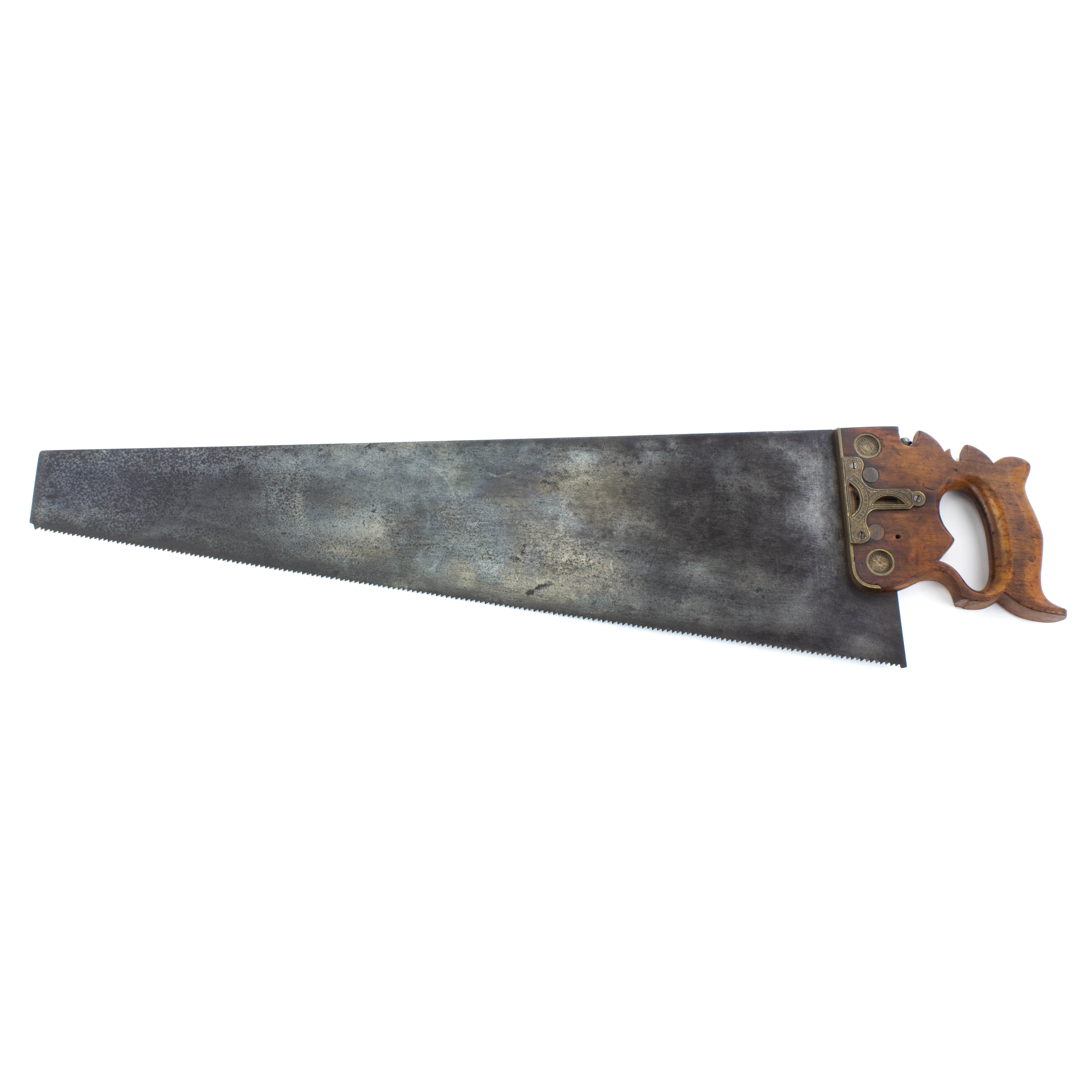 B68-411 COMBINATION SAW. Disston No. 43. Disston's famous combination saw, square, and level. 26" blade with 8 ppi. All the brass is there, as well as the original scratch awl, but one level vial has been replaced. Handle has top horn rounded over and hang hole. One Keystone medallion and one Warranted Superior medallion. User name and date 1899 etched into blade near handle. From the collection of Jerry Kaser. Good 500-1000
