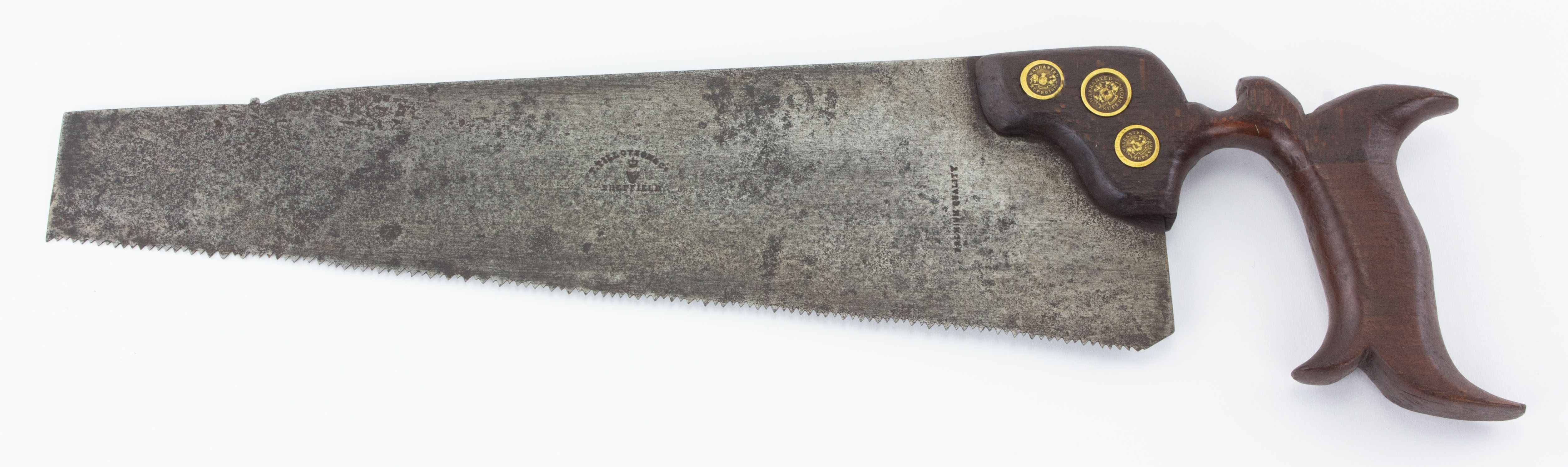 B68-412 PANEL SAW. Tillotson & Co. 12" blade stamped by Tillotson with circa 1860 mark, and also stamped "Premium Quality." Original nib. Three Warranted Superior medallions with split nuts. Restored handle. From the collection of Jerry Kaser. Good 100-200