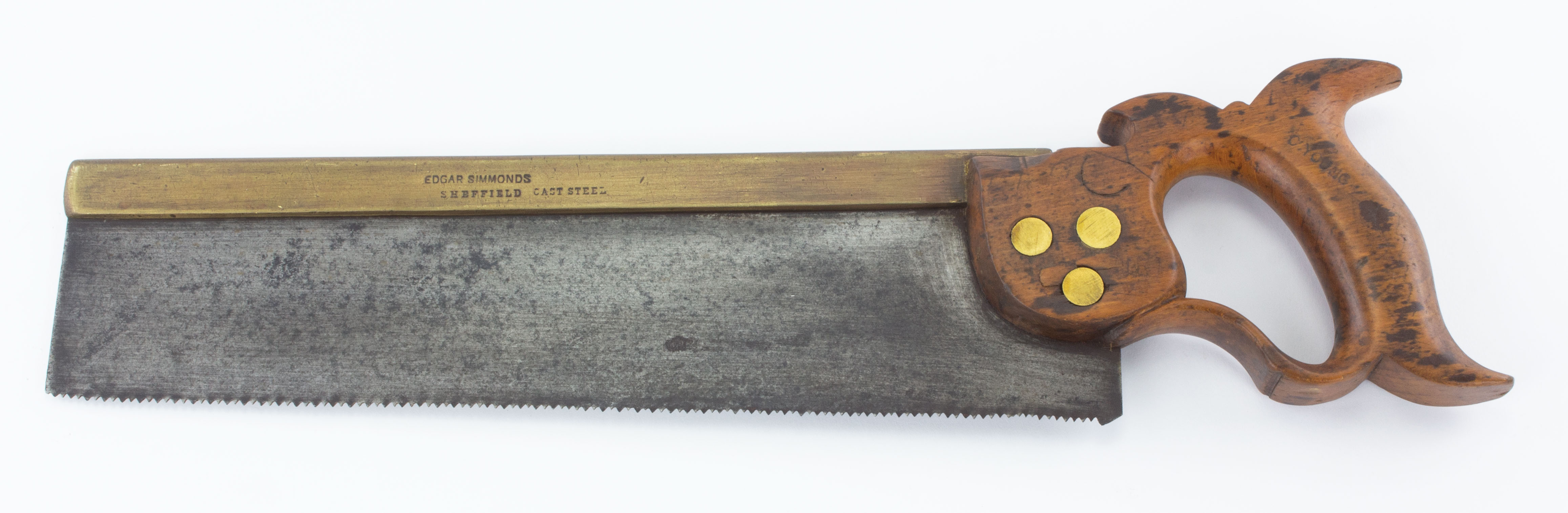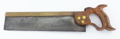 B68-414 BRASS BACKSAW. Edgar Simmonds. 12" blade lambs tongue handle with three split nuts. Marked "Edgar Simmonds Cast Steel" on back; Barley lists Simmonds under Skelton, a maker of heavy edge tools, this mark is circa 1910. Handle has some scratches and chipping, user initials scratched into area above nuts. From the collection of Jerry Kaser. Good+ 100-200
