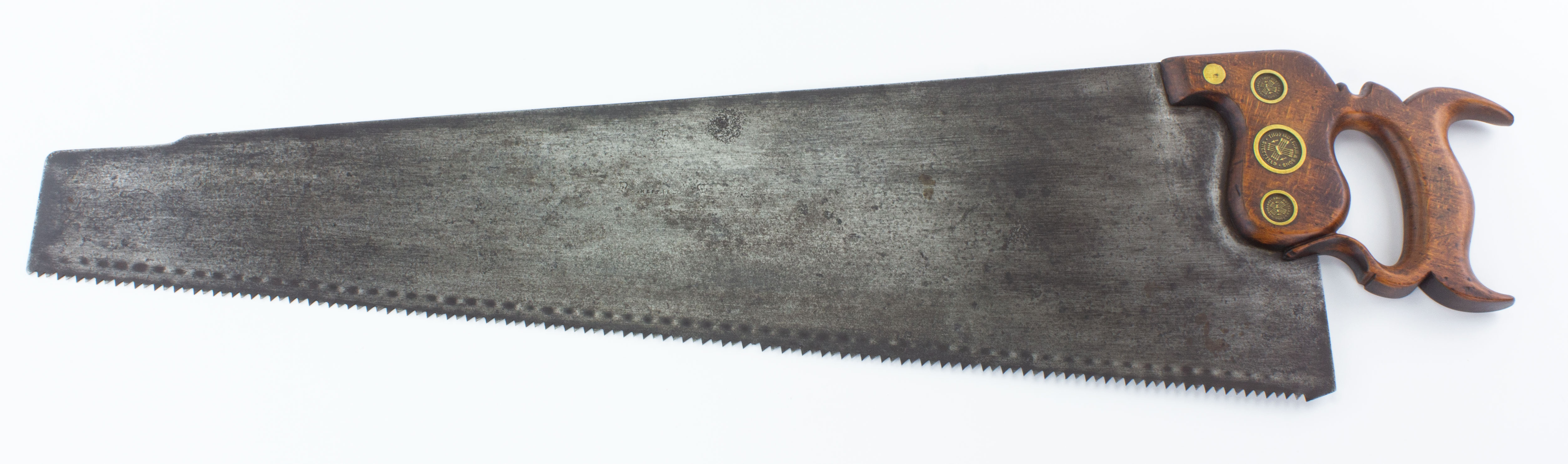 B68-416 CROSSCUT SAW. Thos Mottram & Sons. Circa 1859-1871 manufacturer and merchant of edge tools and cutlery in Sheffield. 26" blade with nib worn off. 6 ppi. Lamb's tongue handle with three fancy medallions depicting crossed arrows and one plain nut, all split nuts. Faint stamp on blade surrounded by crown stamps. Light wear to handle. From the collection of Jerry Kaser. Good+ 150-300