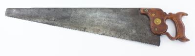 B68-417 RIP SAW. Turner Davis & Co. London maker. 23" blade with nib, lamb's tongue handle with 1" medallion and three split nuts. Nuts are all damaged and medallion is worn. Very faint etch. Wood handle has moderate wear. From the collection of Jerry Kaser. Good 75-150