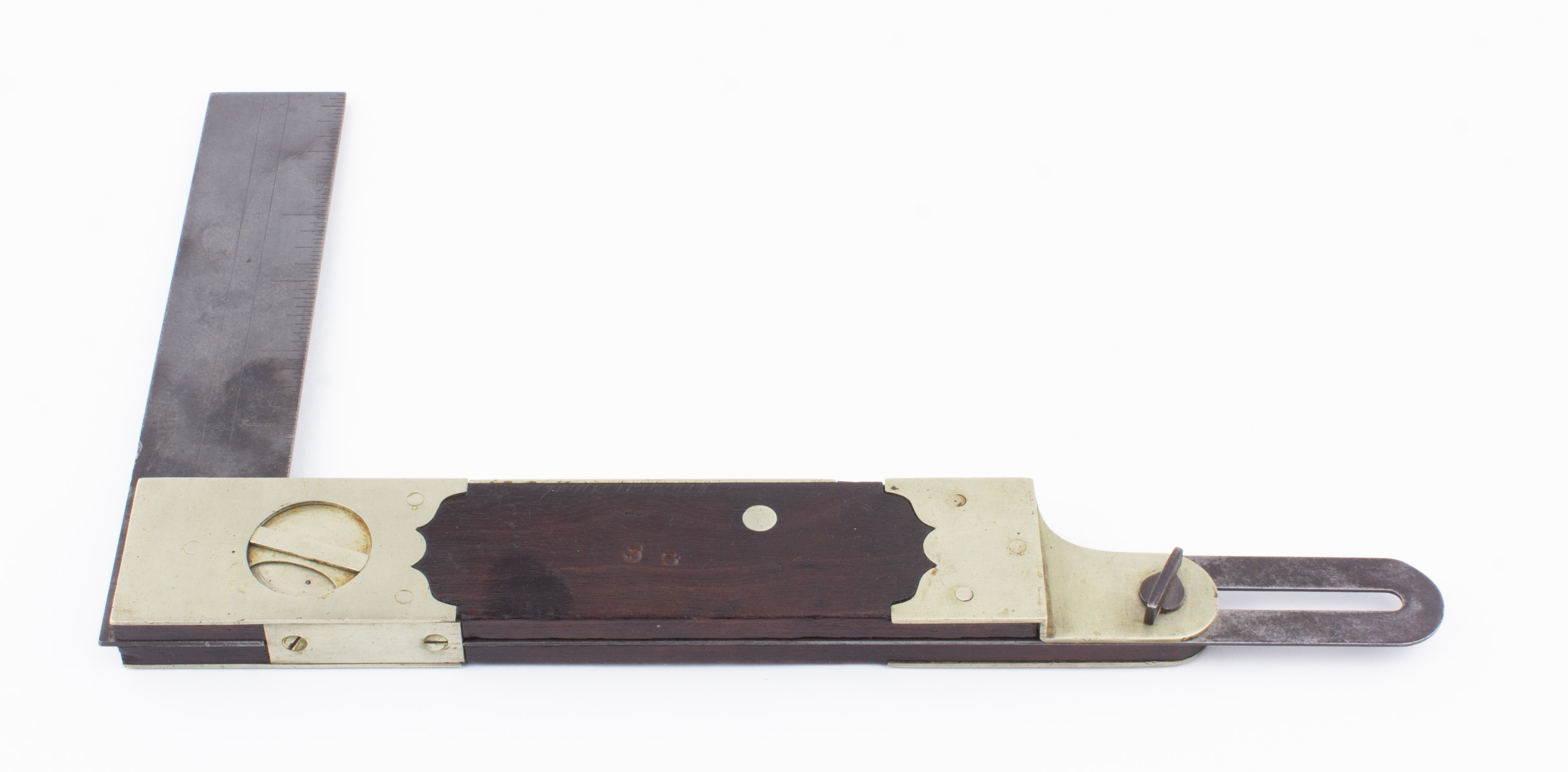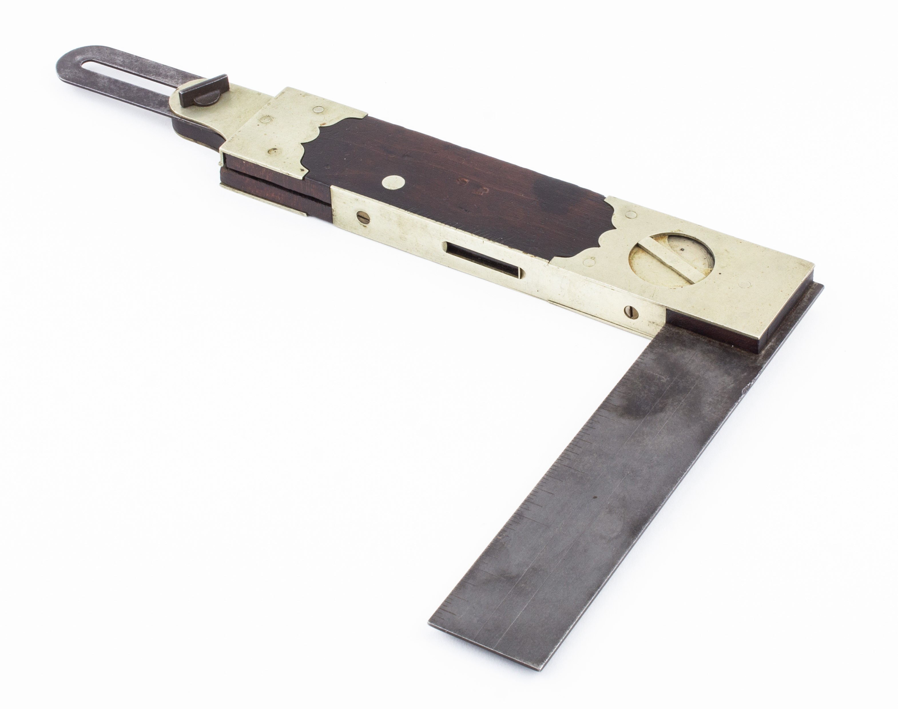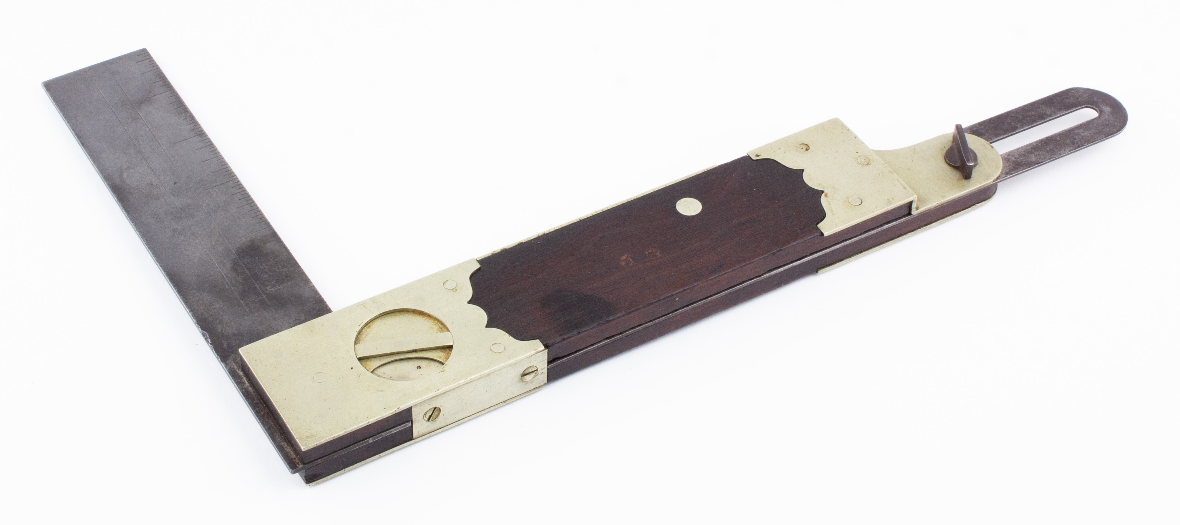 B68-454 COMBINATION BEVEL AND SQUARE. Ritchie Patent. Patented in 1884 by Frederick Ritchie of Vanceborough, ME, manufacturer unknown. This is the high end model with the handle made of very dark rosewood and nickel plated brass, 8-1/2" with fixed 6" blade and rotating bevel blade at the other end. Both level vials original and wet. Some light surface corrosion on the blades, one stain in wood and user initials on handle, otherwise near mint. Good+ 500-1000