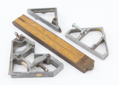 B68-460 LOT OF THREE ALUMINUM RULE ATTACHMENTS. A Robinson Rule, one of the rarest of the rule attachments. It was offered in the 1914 Sears catalog, but who made it and whether it was patented are not known; clamps onto the rule using a simple round head machine screw (possibly a modern replacement). A G.F. Hall patent, manufactured by Boye and marked patent pending, mounted on a Stanley No. 84 rule. Plus a Robert Campbell patent, marked only with the patent date. Condition overall good. From the collection of Steve Dice. Good 200-400