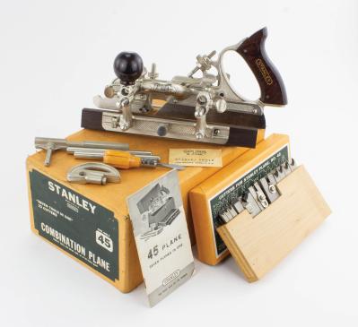 B68-462 COMBINATION PLANE. Stanley No. 45 IOB. Late model with "Stanley" mark on hardwood tote. Mint condition with all parts including complete cutter set in original box, extra spurs in envelope, screw driver, instructions. Pasteboard box with Type 10 label, original packing paper. From the collection of Jim and Becky Leamy. Fine 200-400