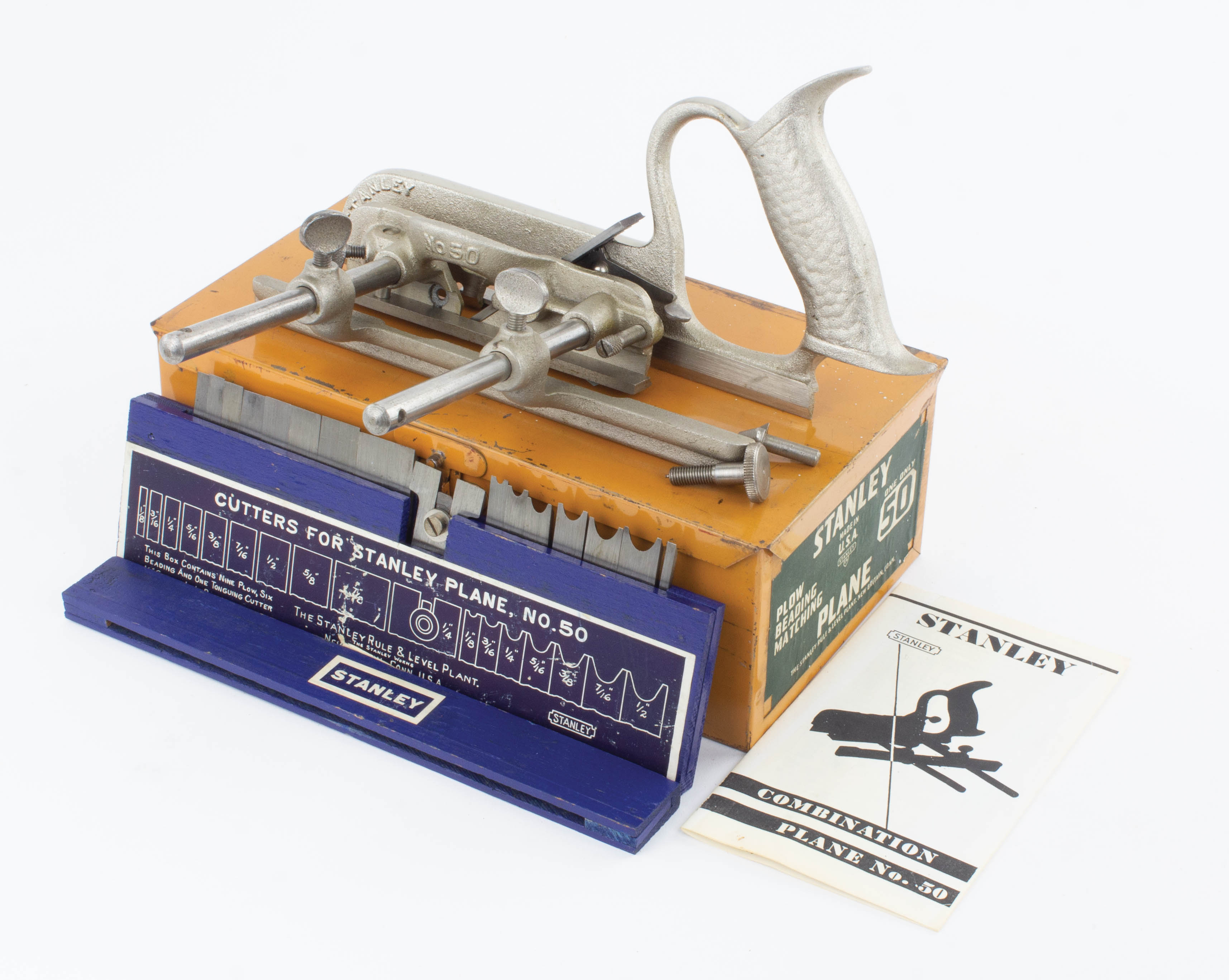 B68-465 COMBINATION PLANE. Stanley No. 50 IOB. Has all its parts including full set of cutters in blue wood box with intact decal, nickel plating fully intact. Steel box with some light scratching and user marking on side, original instruction booklet. Fully intact label. From the collection of Bill Webber. Fine 100-200