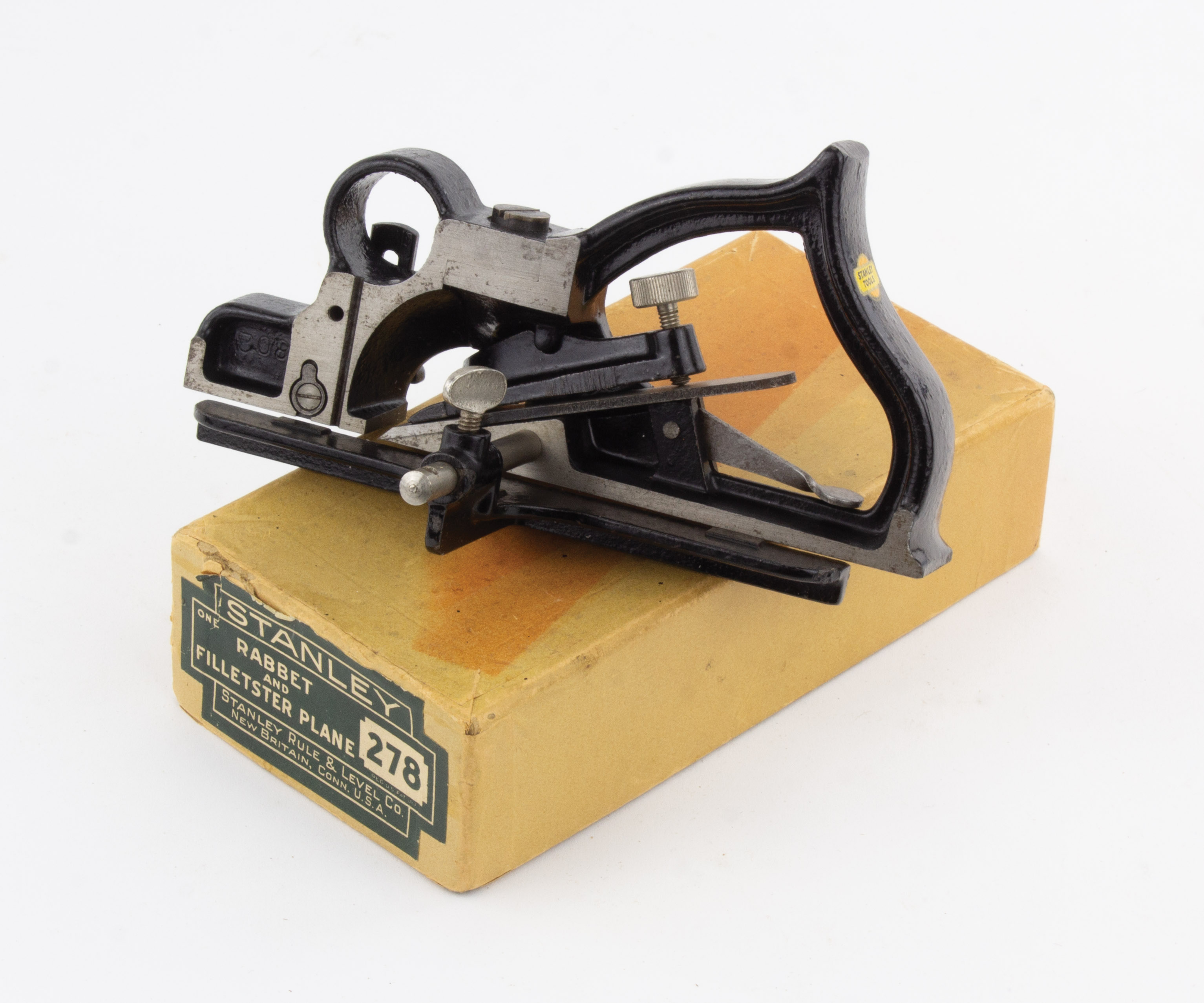 B68-468 RABBET & FILLETSTER PLANE. Stanley No. 278 IOB. Intact decal on tote, proper fence, unmarked cutter, japanning fully intact. Box has one split seam but otherwise intact, Type 6B label is good. From the collection of Bill Webber. Fine 125-250