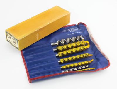 B68-469 LOT OF AUGER BITS IOB. Stanley/Jennings No. 100. Seven bits, five still in original plastic wrap, in original plastic roll. Box fully intact with good label. From the collection of Bill Webber. Fine 50-100