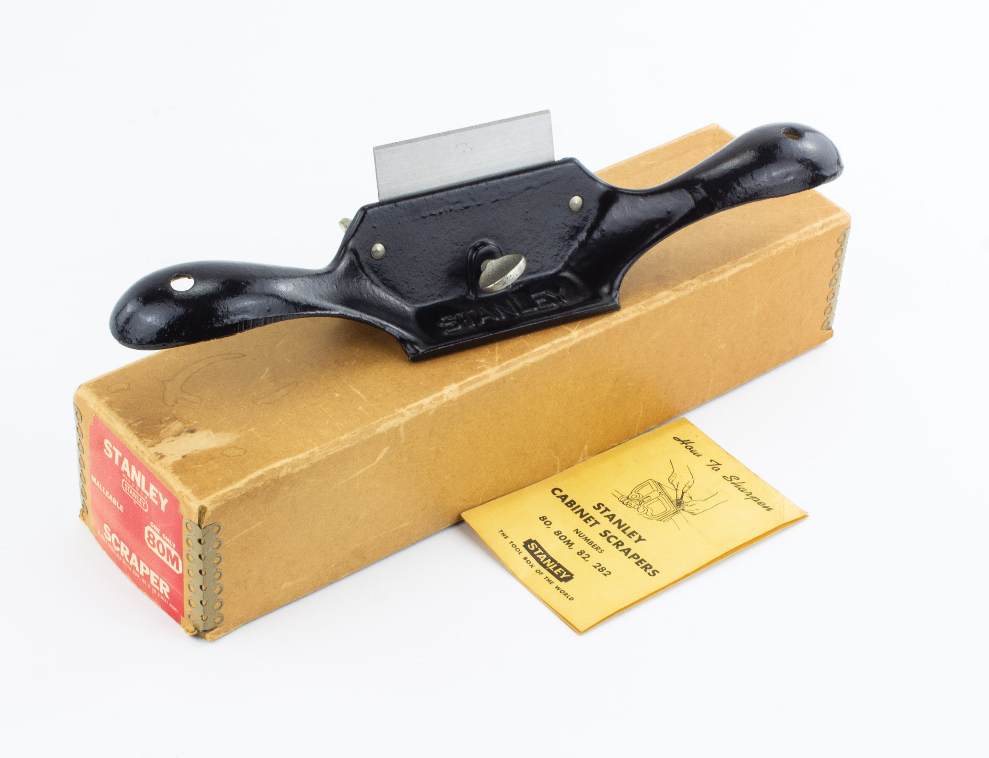 B68-470 SCRAPER. Stanley No. 80M IOB. The version of the No. 80 made of malleable iron to make it less prone to breakage and intended for school shops. Must have worked because this one is near mint with marked cutter, box worn but intact with red label, includes sharpening instruction sheet. From the collection of Bill Webber. Fine 50-100