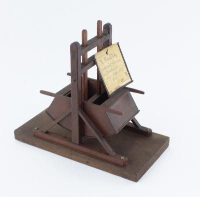 B68-474 PATENT MODEL. Washing and Churning Machine. Issued 4/25/1807 to T. Beatty. One of the very rare patent models that survived the patent office fire of 1836 and were later designated "X" patents when the records could be reconstructed. Has an original tag with the patentee and date but no number, and a second tag indicating that it was part of the collection of American Patent Models, Inc., which was formed in 1939 to acquire the Wellcome collection of models. 10" high, and mounted on a 12" by 6" base, it includes a swinging compartment with a grid suspended in the middle and presumably could be used for either for washing clothes or churning butter. In very good condition and moves smoothly. Pre-1836 patent models are extremely rare. Good+ 600-1200