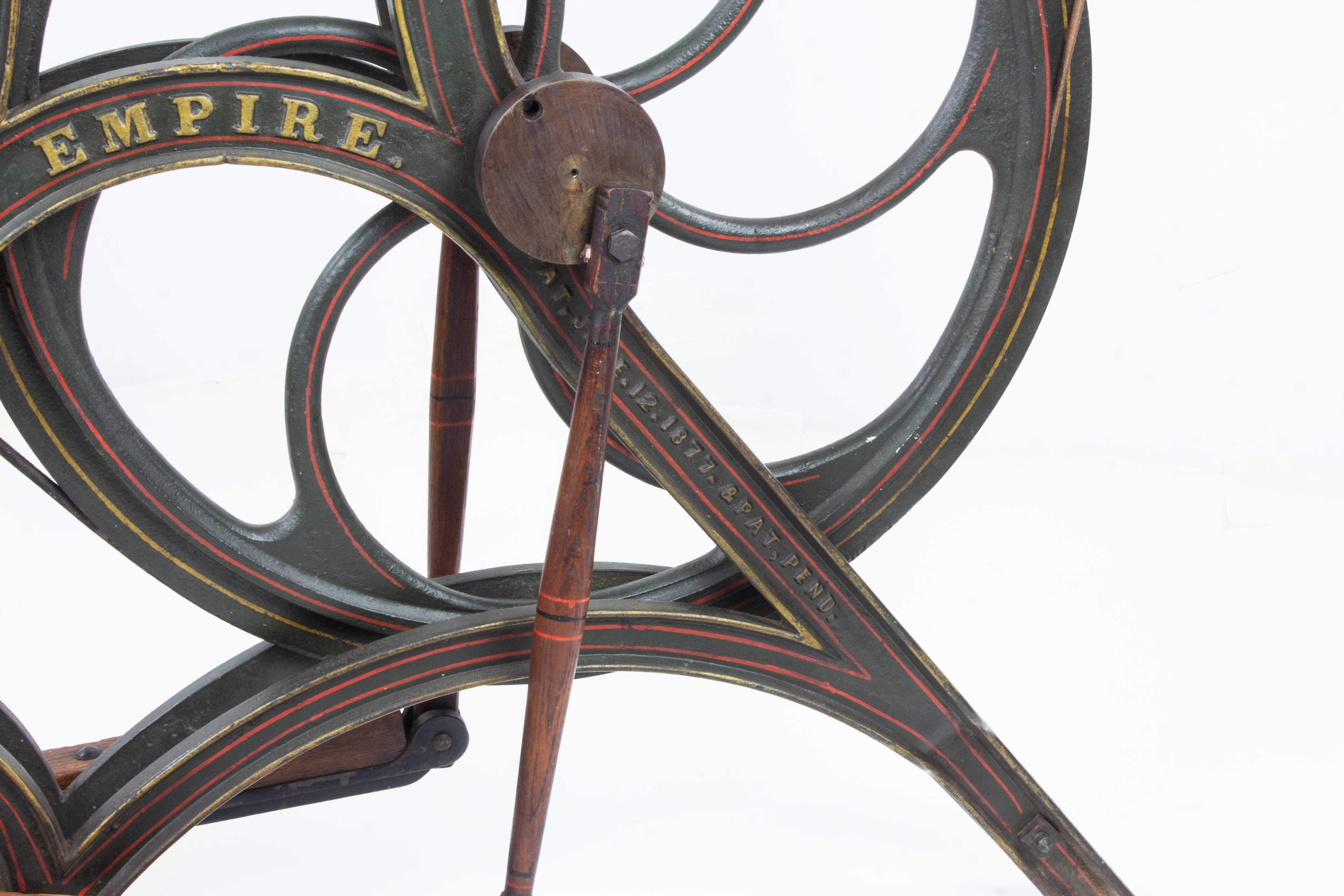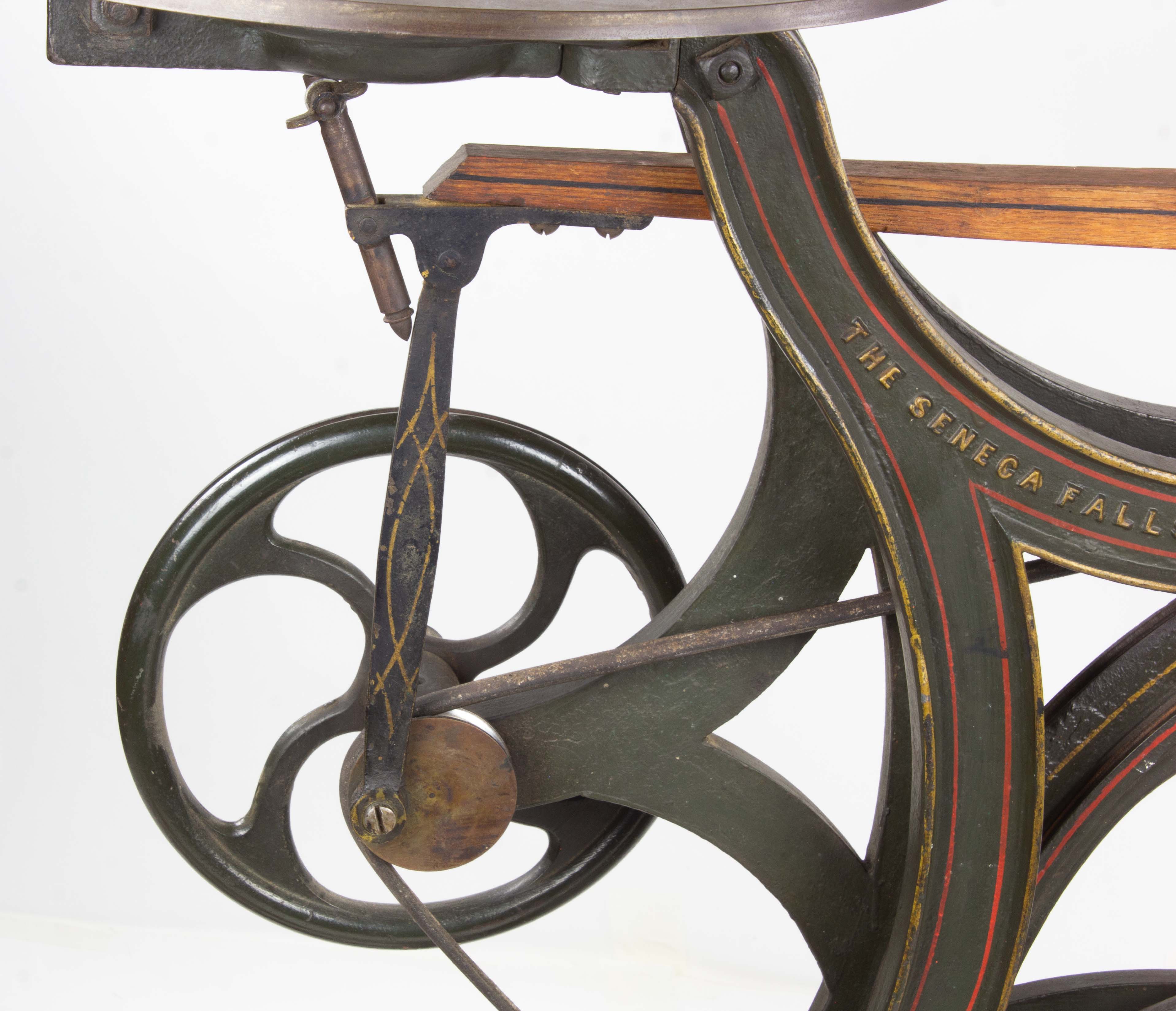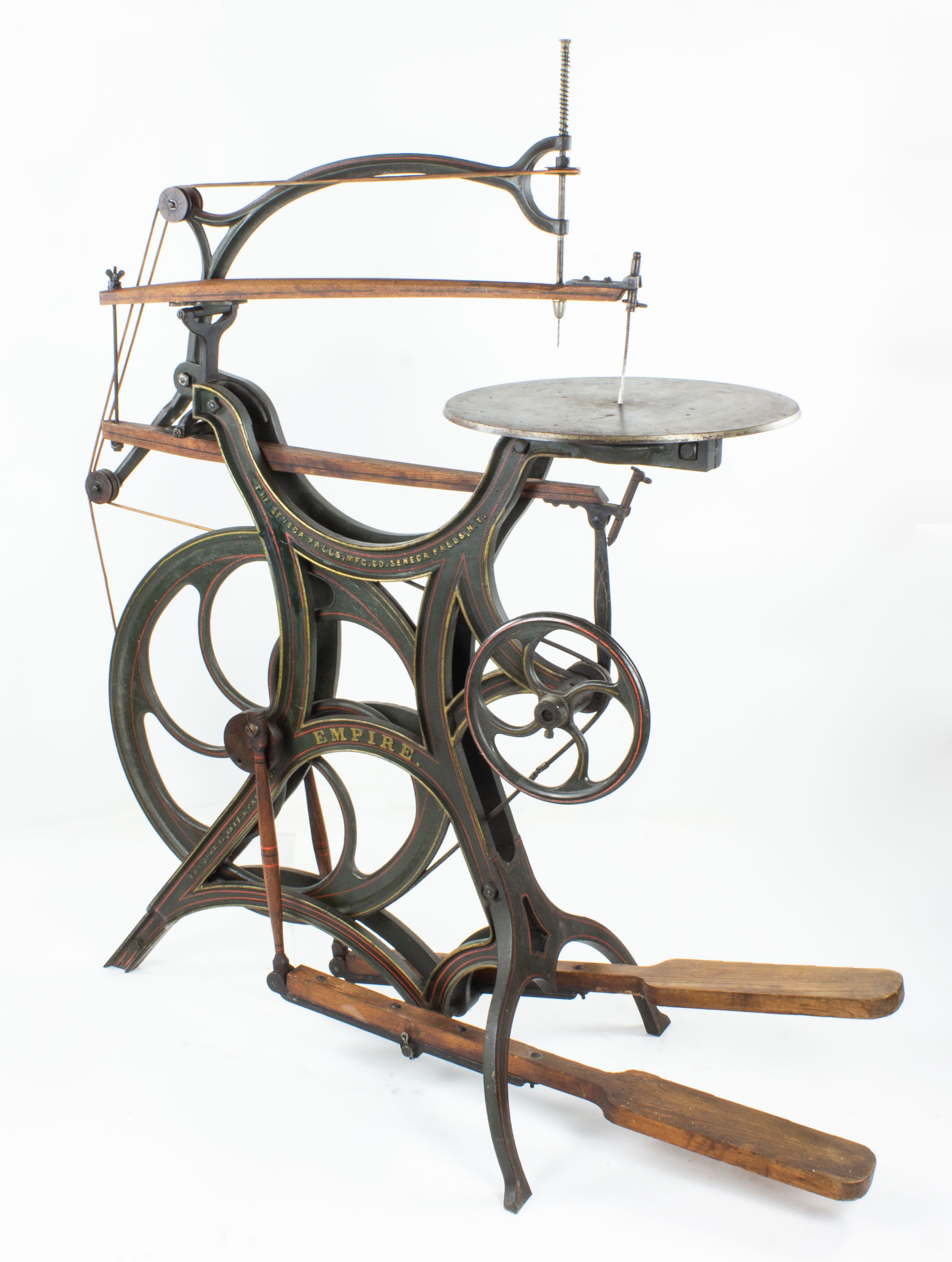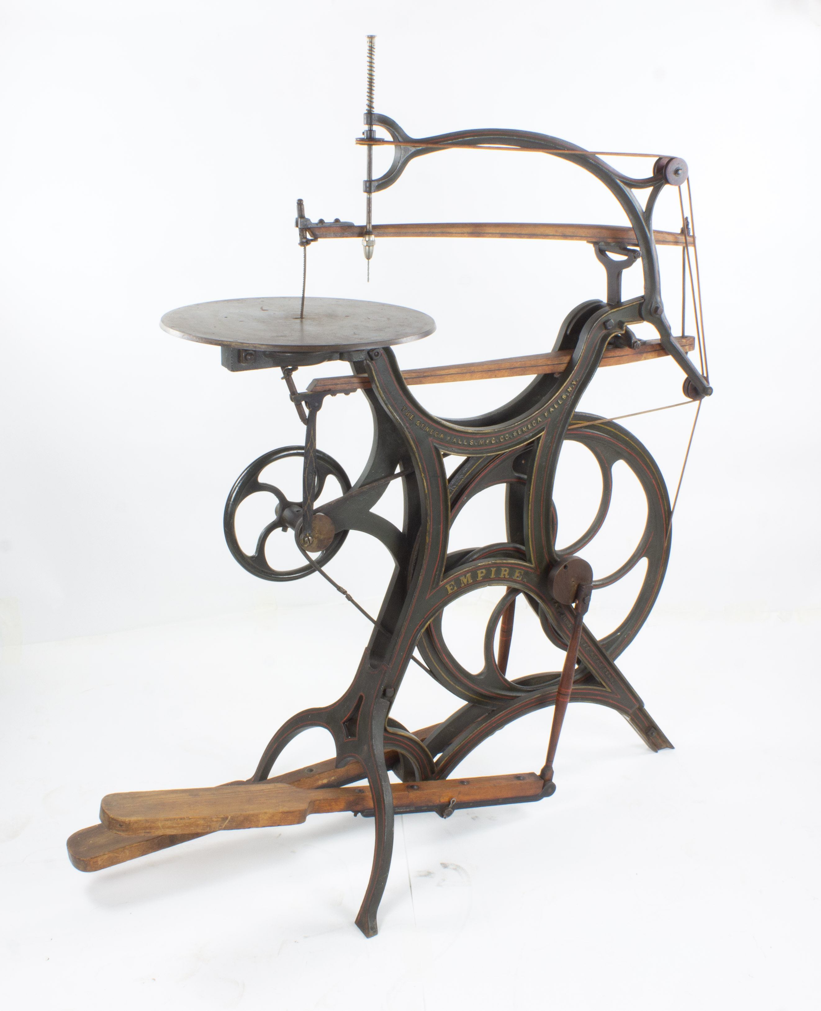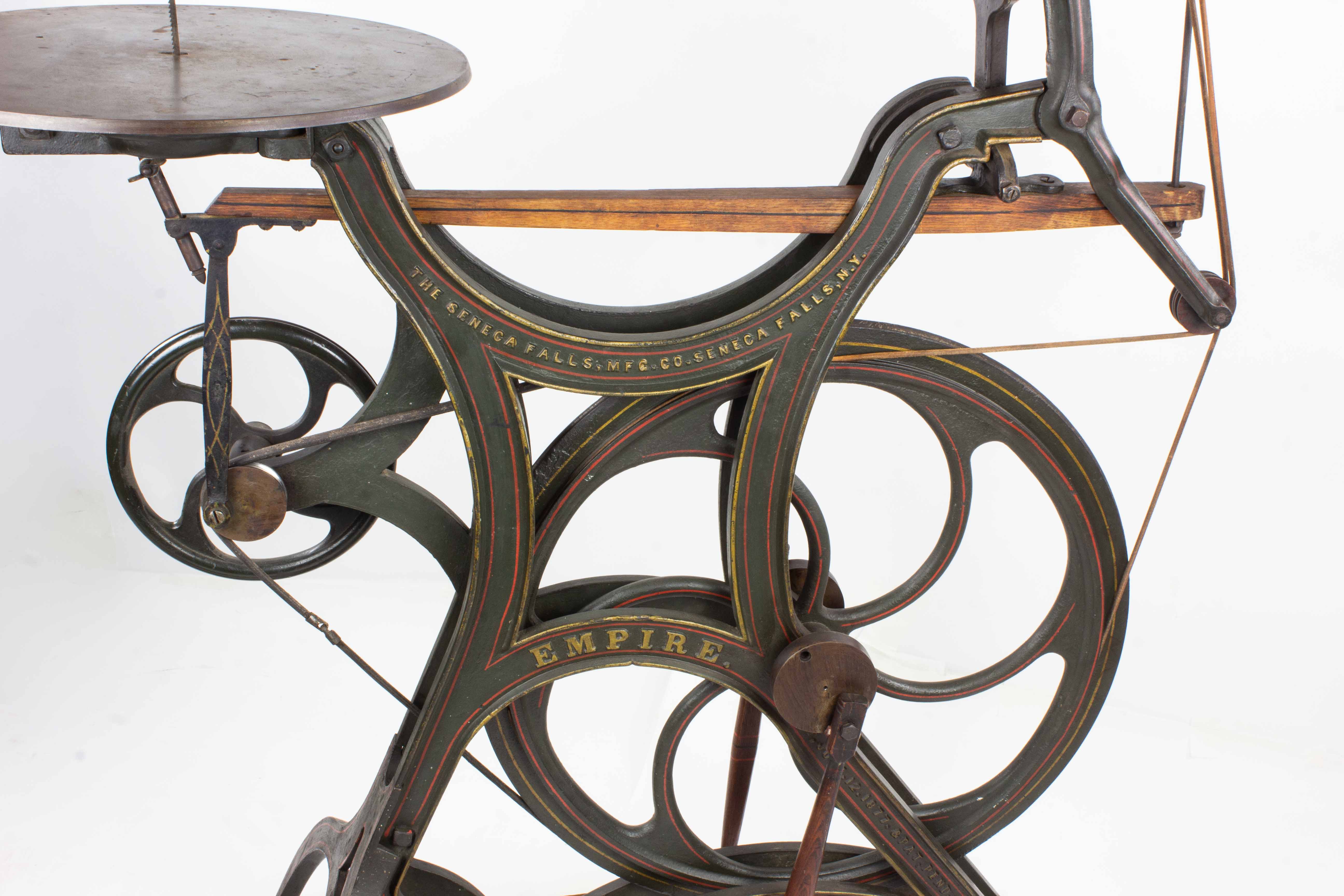 B68-484 PEDAL OPERATED SCROLL SAW. Seneca Falls "Empire." Part of the Seneca Falls line of heavy duty saws for professional use. 55" high, 44" long, paint and pinstriping nearly intact, 17-1/2" tilting table based on Lewis' 1877 patent. 24" arm, includes the drilling attachment complete with bit. Belts complete and look original. Needs a new saw blade (the one it has is broken off at lower clamp), and maybe a little 3-in-1 oil on the drill where it slides through the bracket, but other than that you're good to go. Fine 500-1000