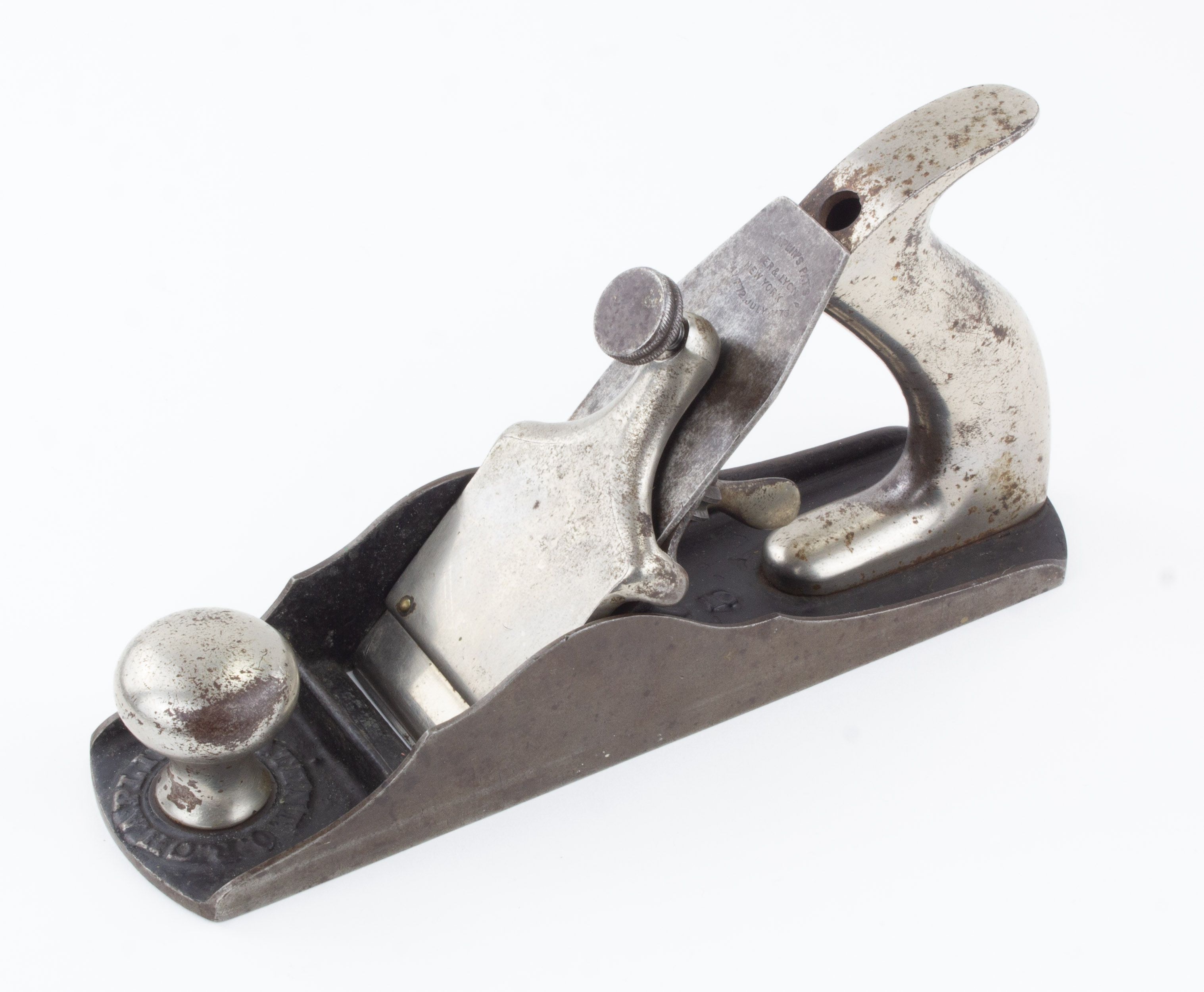 B68-499 JACK PLANE. Chaplin Patent No. 5. O. R. Chaplin's first patent, manufactured by Tower & Lyon, 9" sole with "5" cast behind front; non-adjustable throat, iron tote and knob; "Chaplin's Patent" cast around knob, proper 2" marked cutter. Japanning 90%, nickel plating on tote, knob and lever cap have some light corrosion. From the collection of Harold Unruh. Good 200-400