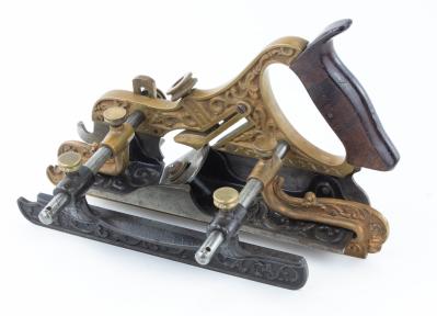 B68-502 MILLER'S PATENT COMBINATION PLANE. Stanley No. 42. Type 4, pre-slitter type with wraparound fence. Tote has some light chips but no major damage, metal very clean. Has filletster bed with cutter, no other cutters. From the collection of Steve Dice. Good+ 750-500