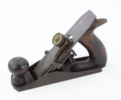 B68-505 SMOOTHING PLANE. Standard Rule No. 3. Early version sold by Standard in the 1880s prior to the merger with Upson Nut and based on the Rusts' 1883 patent. 8" sole and 1-3/4" proper marked cutter. Traces of japanning, nickel plating on lever cap mostly gone, metal oxidized but no rust or pitting knob and tote have mild wear. Good 120-240