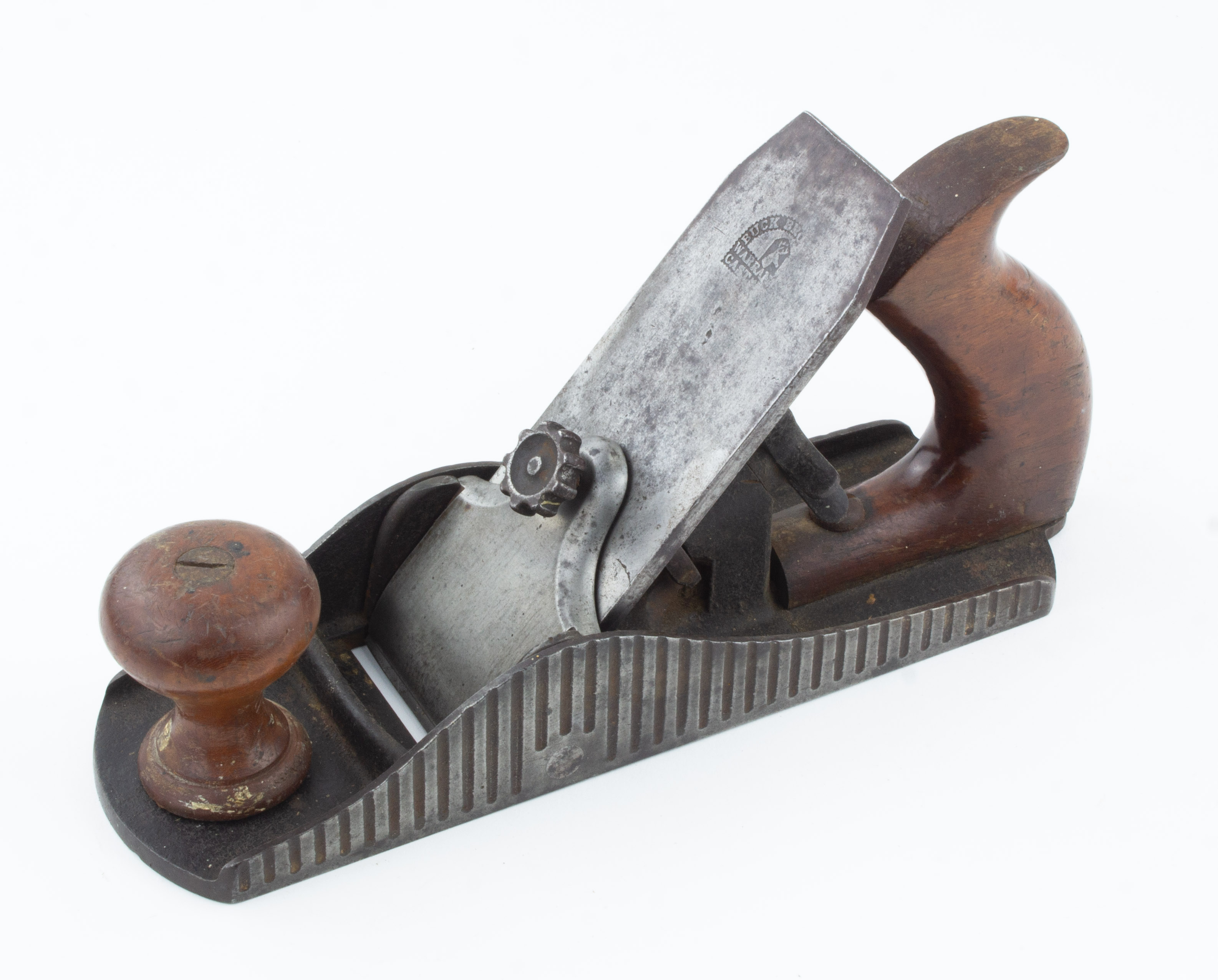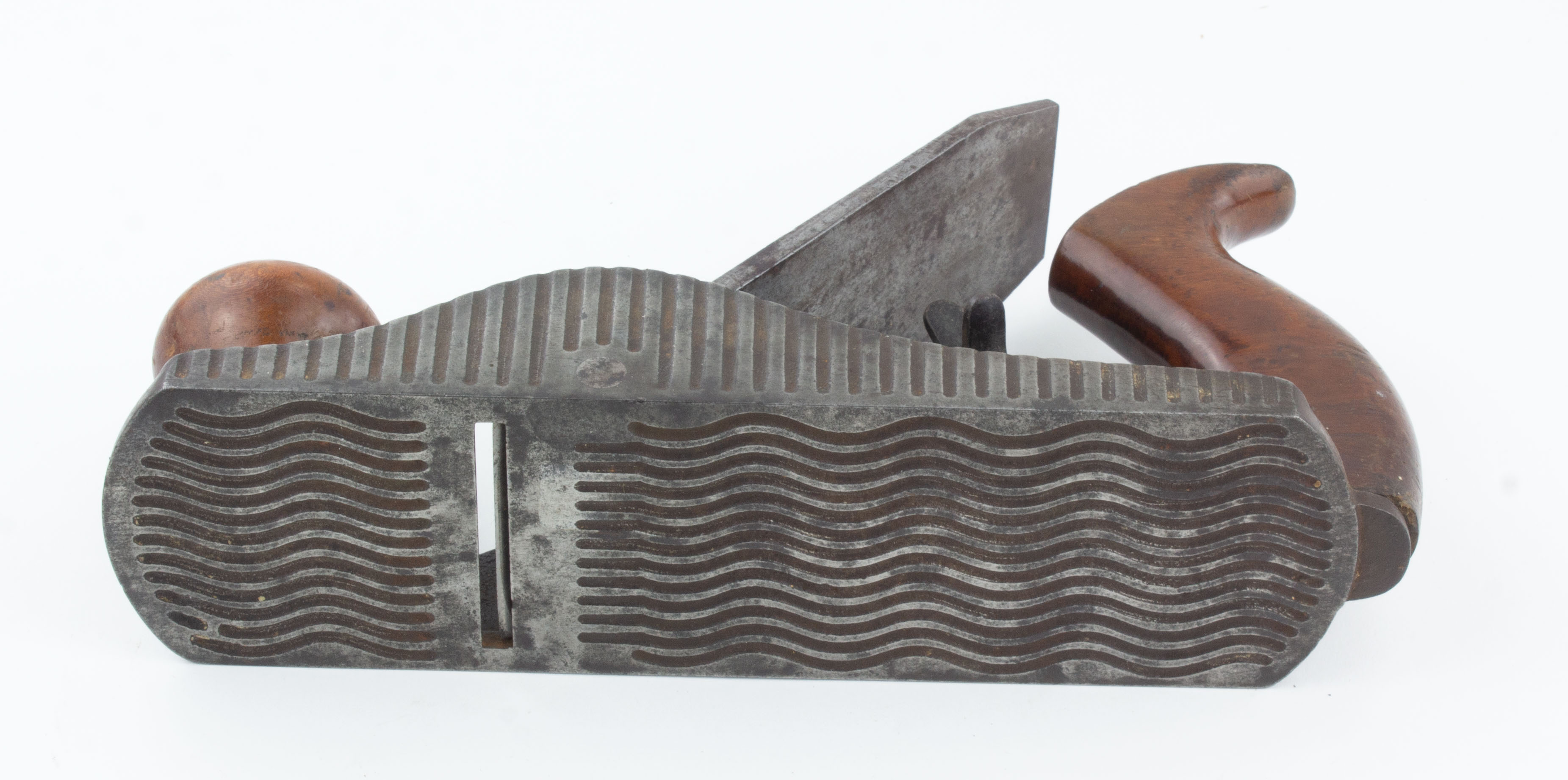 B68-513 SMOOTHING PLANE. Louis Rodier Patent. Rodier's 1879 patent was for his adjustment mechanism, intended to simultaneously regulate the set of the cutter and the width of the mouth, but his planes, manufactured by Laflin Mfg. Co., are best known for their corrugated sides and the serpentine grooves cast into the sole. This one has a 9" sole, and a 2-1/8" Buck Bros. cutter. Wood has light wear, japanning 80%, metal clean. From the collection of Harold Unruh. Good+ 600-1200