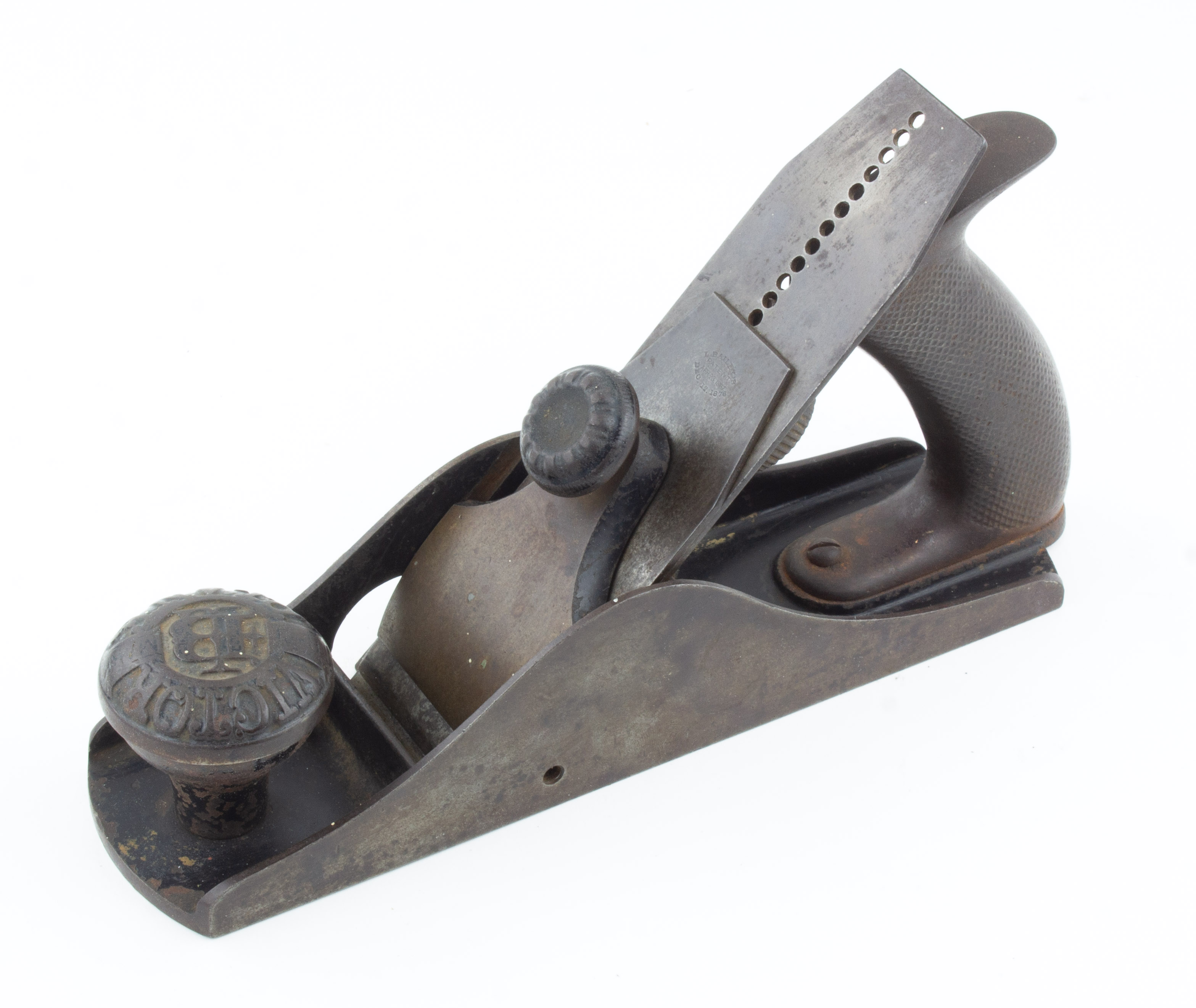 B68-514 SMOOTHING, RABBET & FILLETSTER PLANE. Bailey Victor No. 11. One of the rarest and hardest to find of Bailey's Victor line. Missing its depth stop and fence, as most examples are, but what's there is in decent condition. Version with cap screw, original marked chip breaker, 75% japanning, nickel plating worn off lever cap, casting on knob is worn but clear, a couple of small paint splotches. From the collection of Harold Unruh. Good 200-400