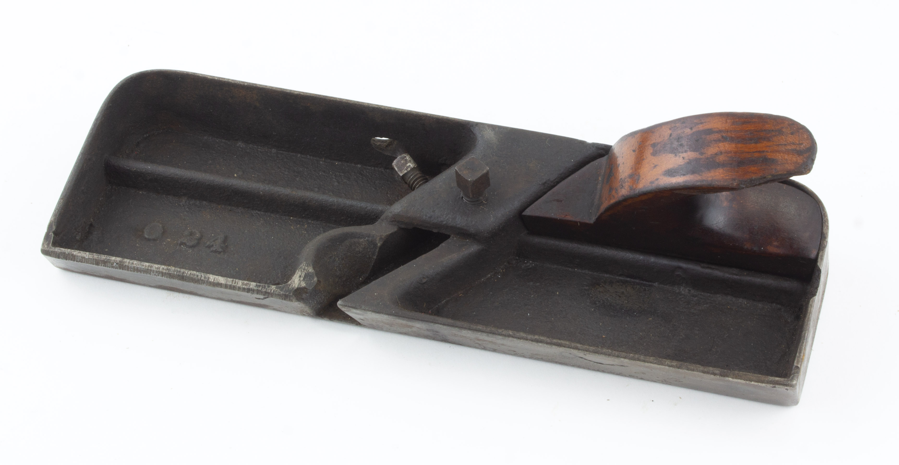 B68-516 METAL FILLETSTER PLANE. Marked only "024" but looks manufactured. 9" sole, set at an angle to the body, it's possible the cutter was intended to be reversible but it's missing. Rosewood tote has a large chip, metal oxidized. Frame has chipped edge at rear and has been ground at the throat. From the collection of Harold Unruh. Good 100-200