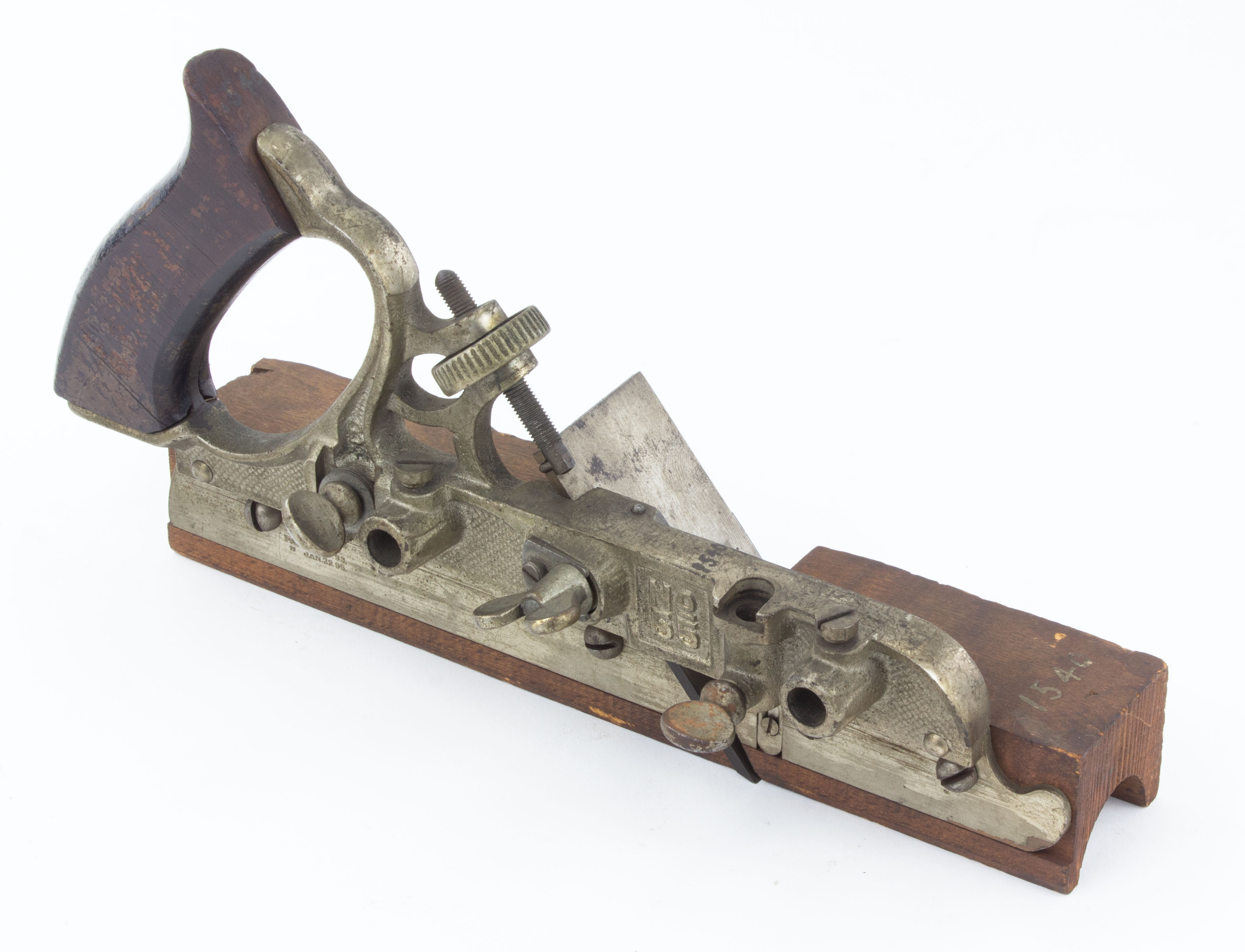 B68-518 MODEL SHOP PROTOTYPE. Round Cutter. A No. 55 body with a wooden attachment to cut a 1-1/4" round, similar to the hollow and round attachments furnished with the No. 45. The wooden attachment has a model shop number 1540 painted on the toe. Nickel plating is faded and the tote has a crack. Never put into production. From the collection of Harold Unruh. Good 500-1000