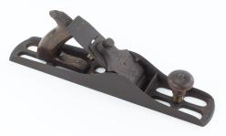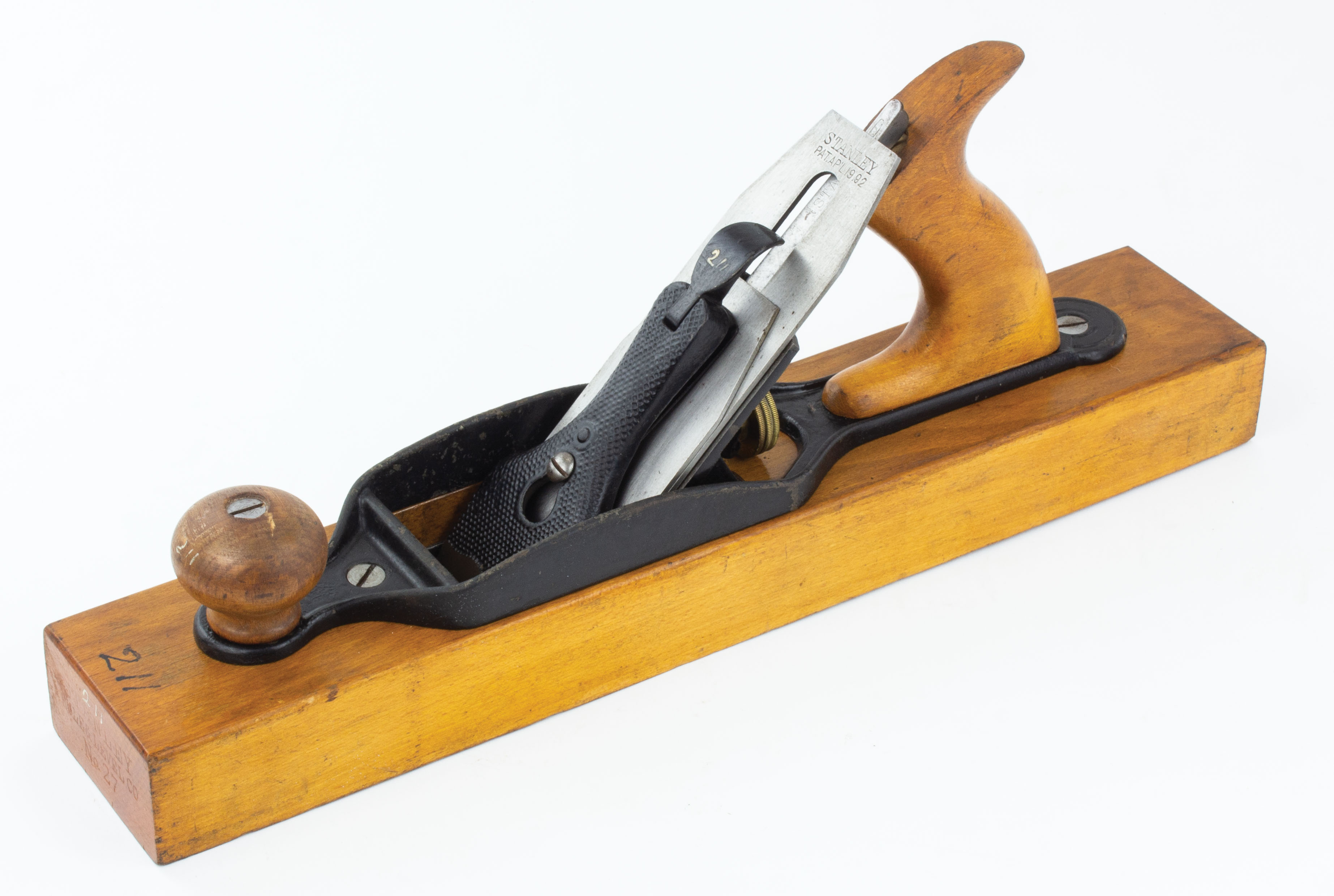 B68-521 MODEL SHOP PROTOTYPE. Steel Throated Transitional. A Stanley No. 27 transitional jack plane, Type 9, in which the frog extends to form a steel lining to the throat, and terminates in a 1" by 2" steel plate inset into the sole that surrounds the mouth. The model shop number 211 is written on the plane in four separate locations. Never put into production. The plane itself is in near fine condition, as would be expected of a tool that was never used, with complete finish (noting some light staining on the sole) and 99% japanning. From the collection of Paul van Pernis. Fine 1500-3000