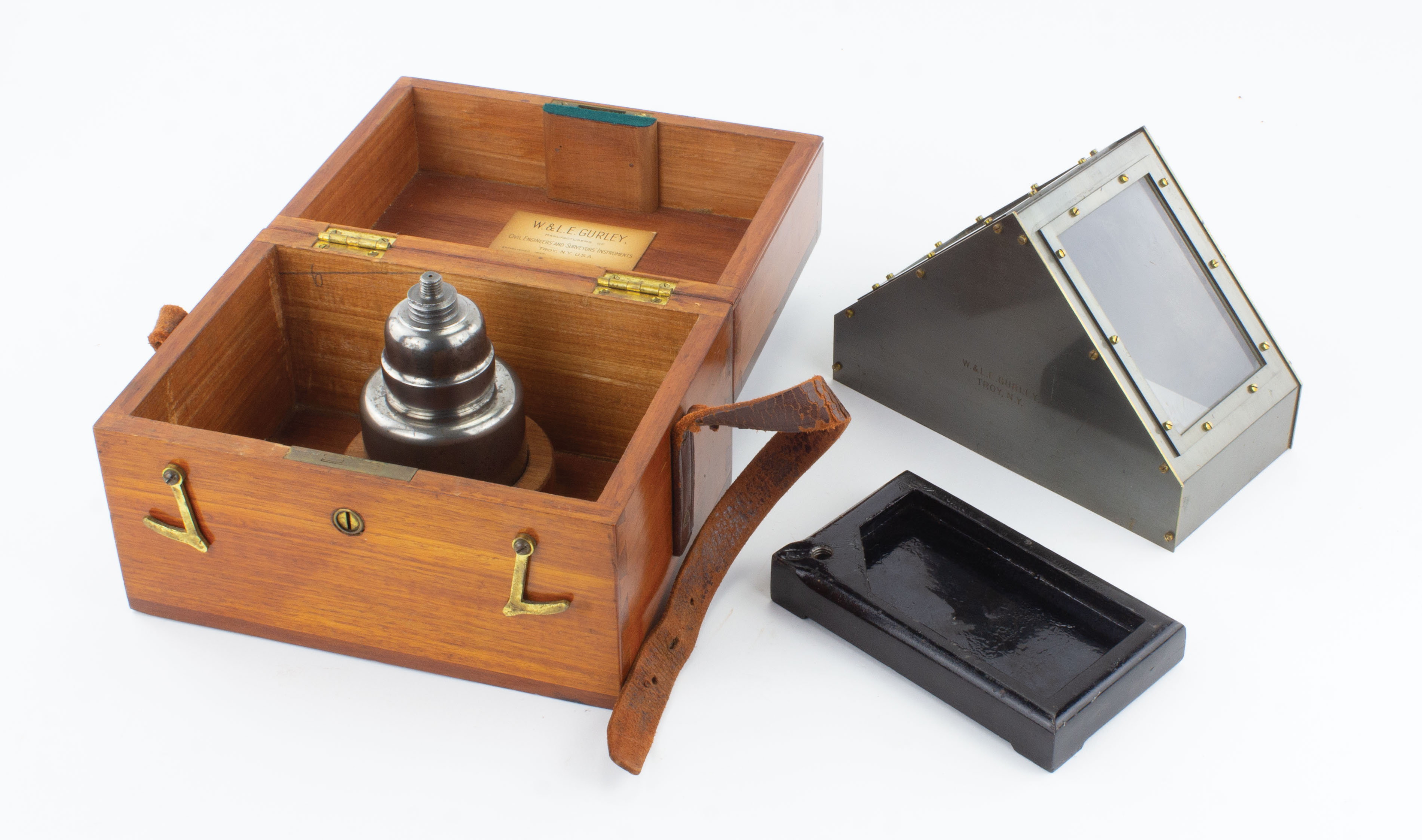 B68-527 ARTIFICIAL HORIZON. W & L.E. Gurley. 7-1/4" long with base and tray, inside original wooden box with Gurley label in lid. In like new condition. Artificial horizons are used in surveying and navigation when the horizon was not visible, by sighting on the reflection of a star in a flat pool of liquid, in the old days typically mercury. From the collection of Chuck Morgan. Fine 150-300